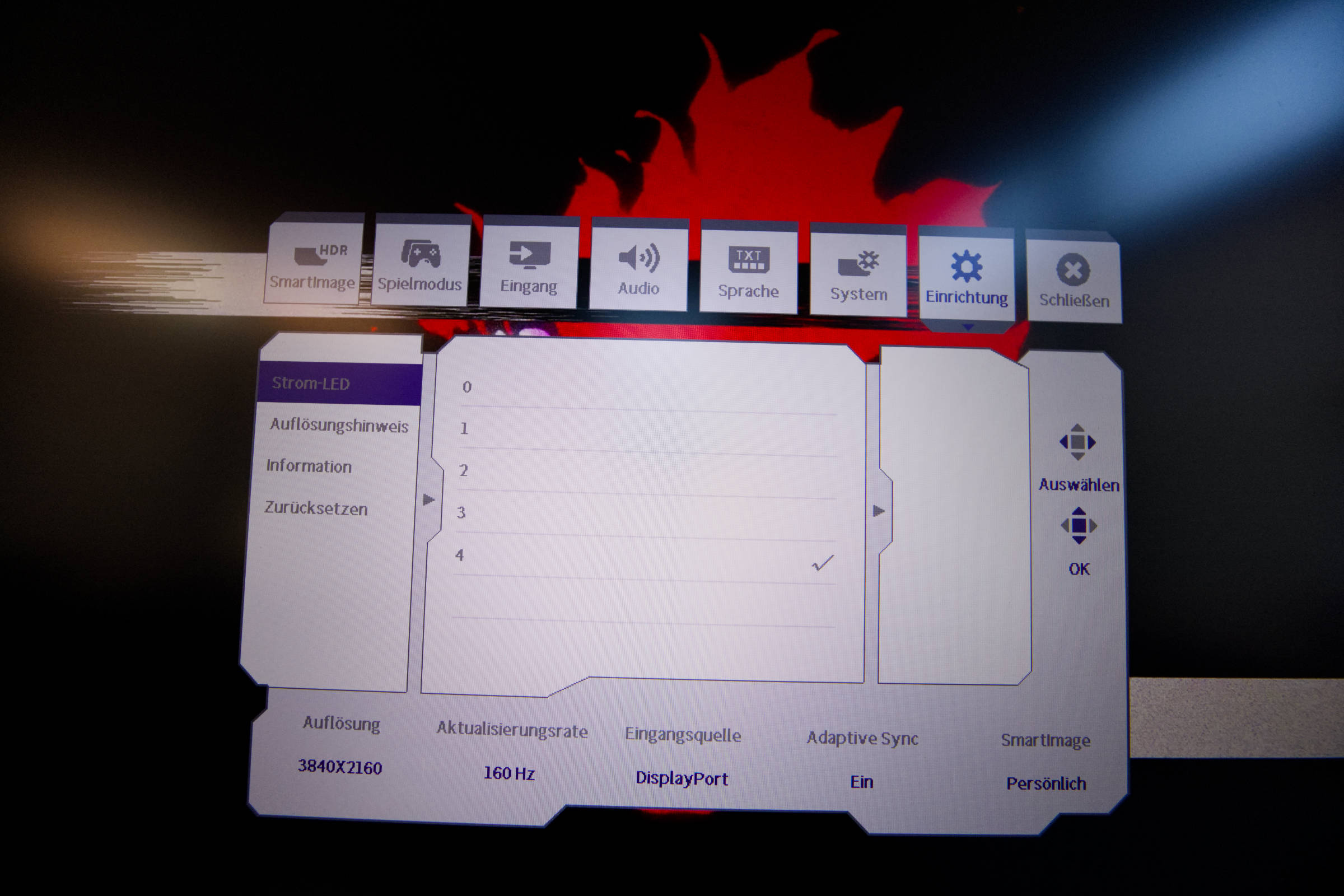 Unter “Einrichten” ist dann noch die LED-Helligkeit einstellbar. Wir fanden die Stufe 4 und 3 besonders störend, am besten war 1 oder 0.