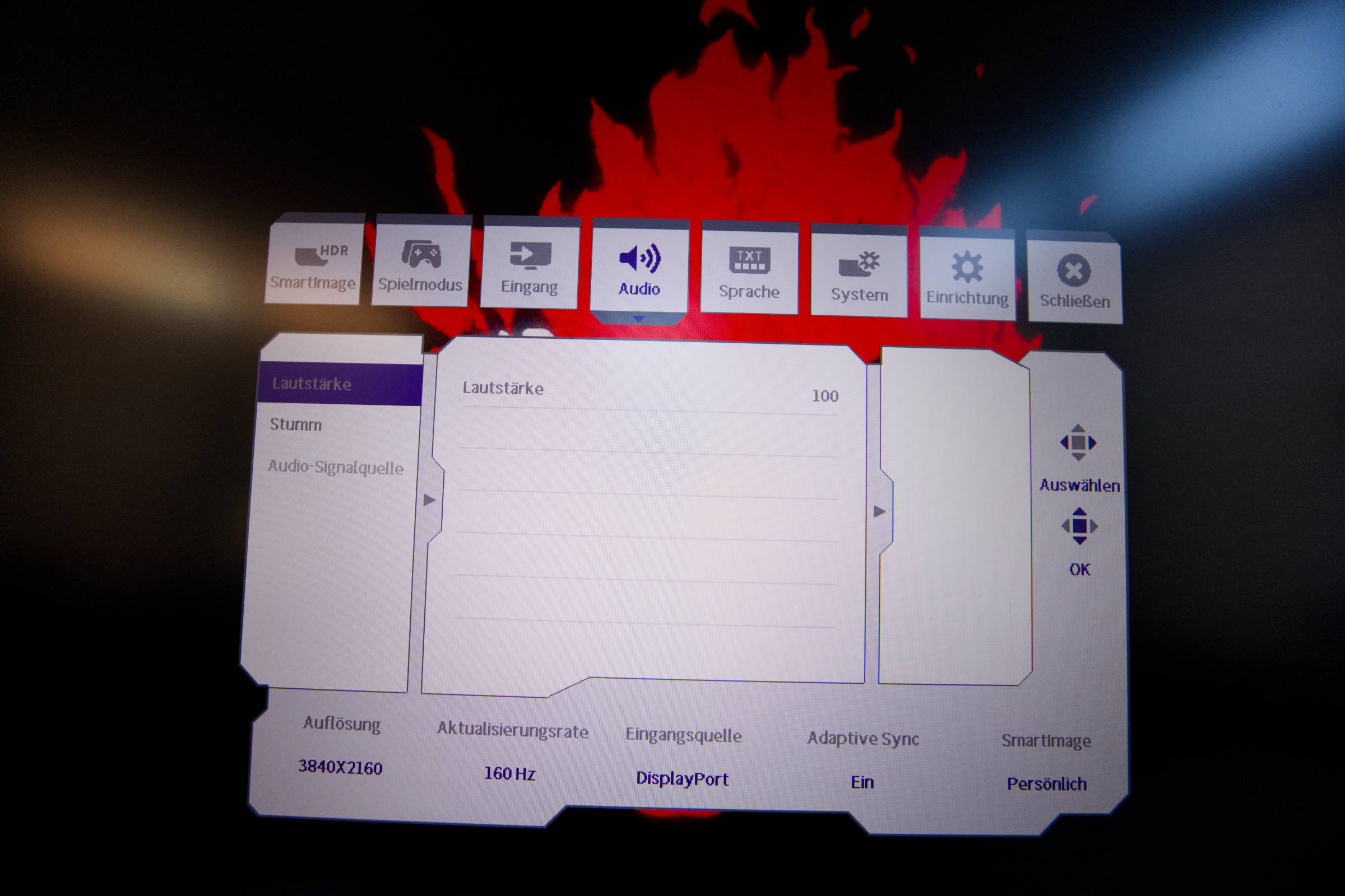 Wie bereits erwähnt, bietet der Monitor auch zwei Lautsprecher, die oben integriert sind und durchaus guten Klang bieten. Im OSD gibt es für die Einstellung dieser drei Optionen, die man unter dem Menü “Audio” findet. Die Einstellungen sind selbsterklärend.