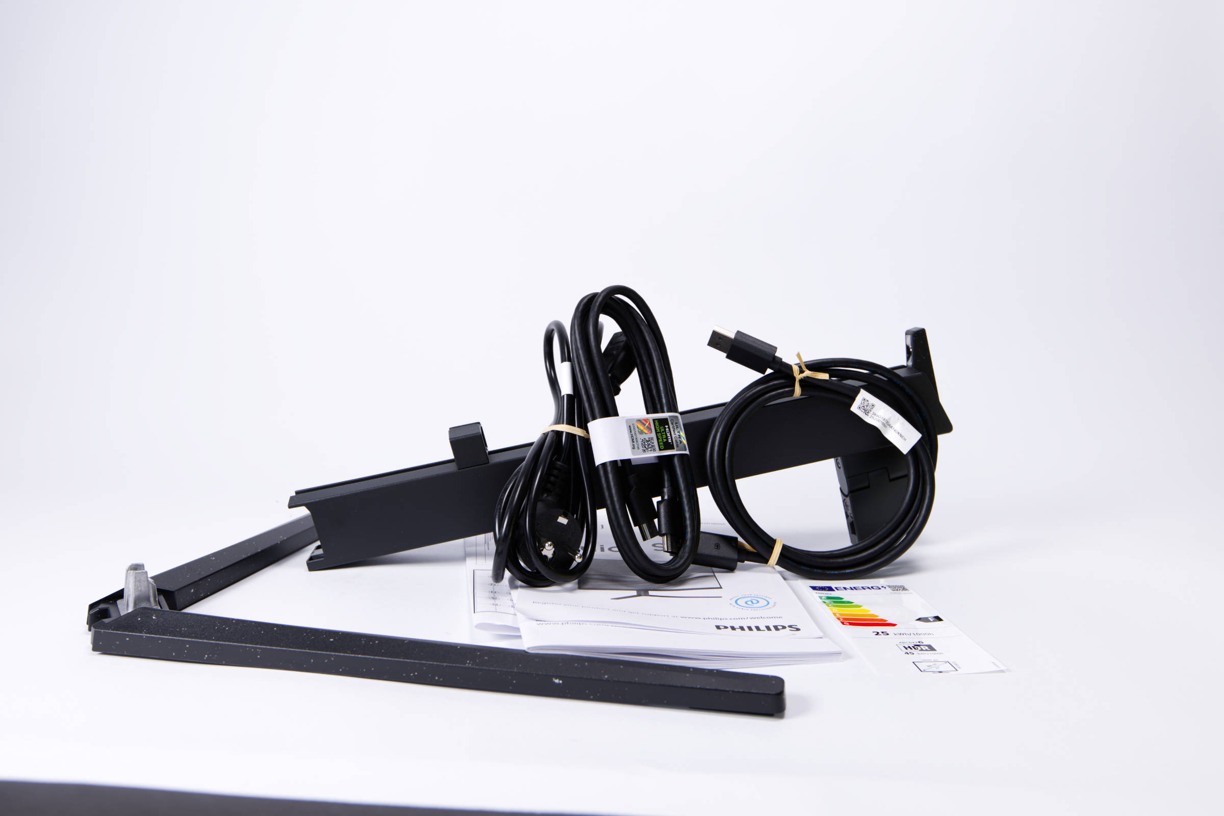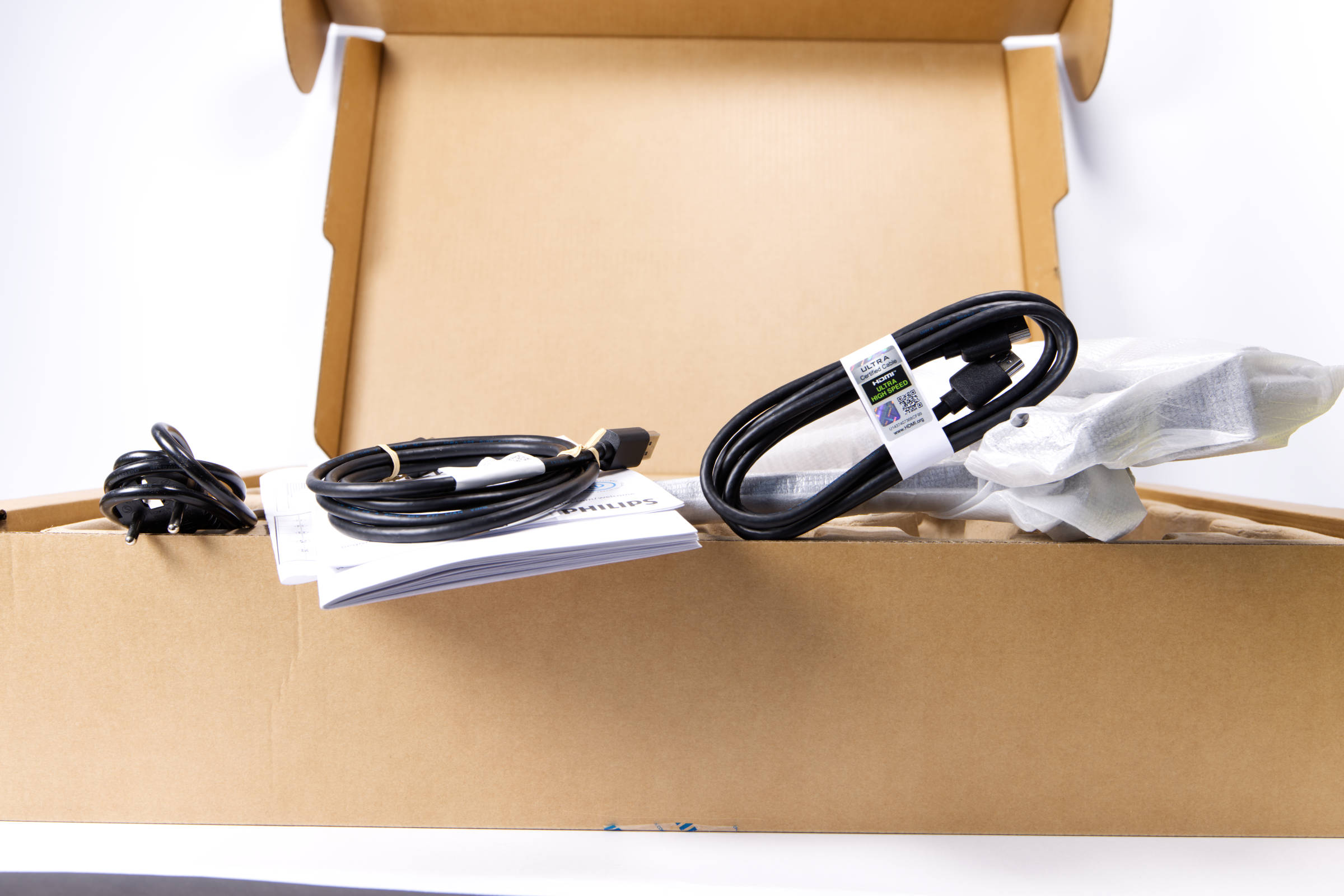 Oben auf dieser Schale finden wir ein Handbuch, den Standfuß und ein DisplayPort- sowie ein HDMI-Kabel und dann noch das Stromkabel. Der Lieferumfang ist überschaubar, jedoch ist alles für den Betrieb Notwendige enthalten.