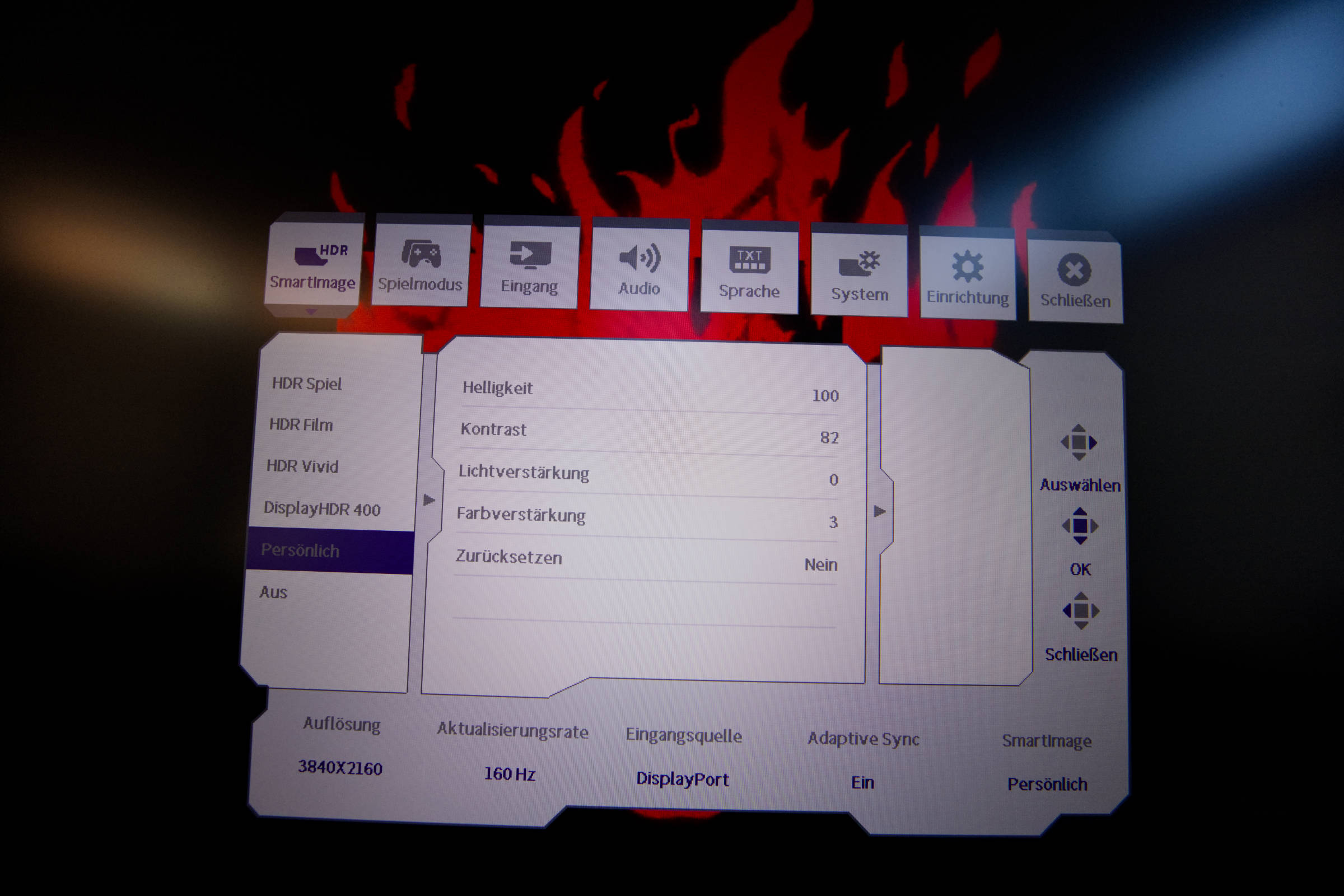 Wer direkt über den Monitor Anpassungen vornehmen will, kann das über das „Persönlich“ Profil machen. Dabei stehen einem die Optionen für Helligkeit, Kontrast, Lichtverstärkung und Farbverstärkung zur Verfügung.