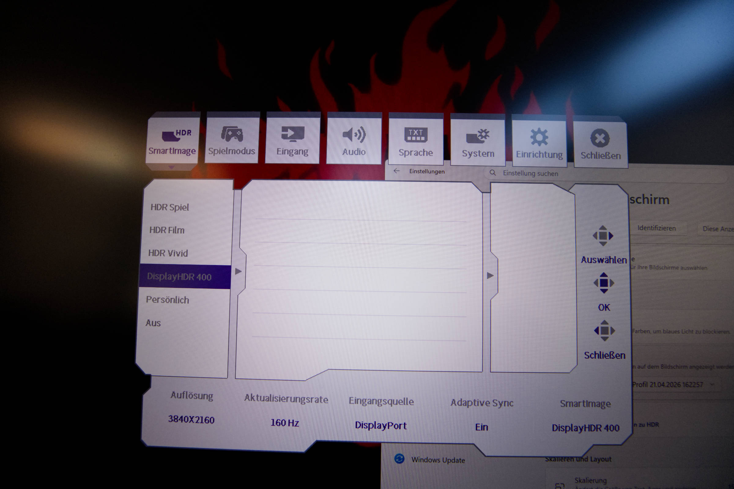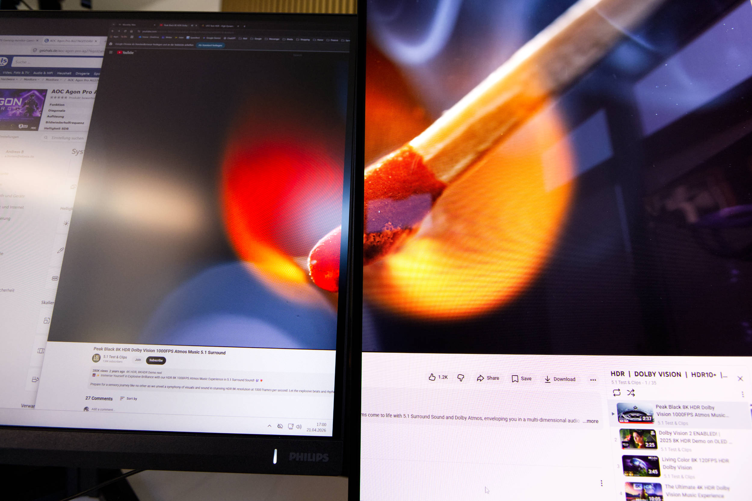 Der HDR400 Modus ist unter Windows erst sinnvoll, wenn die HDR-Kalibrierung durchgeführt wurde. Die Standardoption ist unserer Meinung nach unbrauchbar, weil alles einfach einen schlechten Kontrast hat und wir lieber im SDR-Modus arbeiten. Nach dem Aktivieren von HDR kann man auch noch im OSD weitere Anpassungen vornehmen und z.B. das DisplayHDR400 Profil laden, aber uns kam die Arbeit in Windows damit fade vor. In Spielen sieht das dann aber deutlich besser aus und der Abstand zum QD-OLED wird geringer, wenn man HDR-Content schaut. Das nachfolgende Bild zeigt den Evnia 3000 27M2N3800A links und den AGON PRO AG276QZD2 rechts bei Verwendung des DisplayHDR-Profils auf beiden Monitoren.
