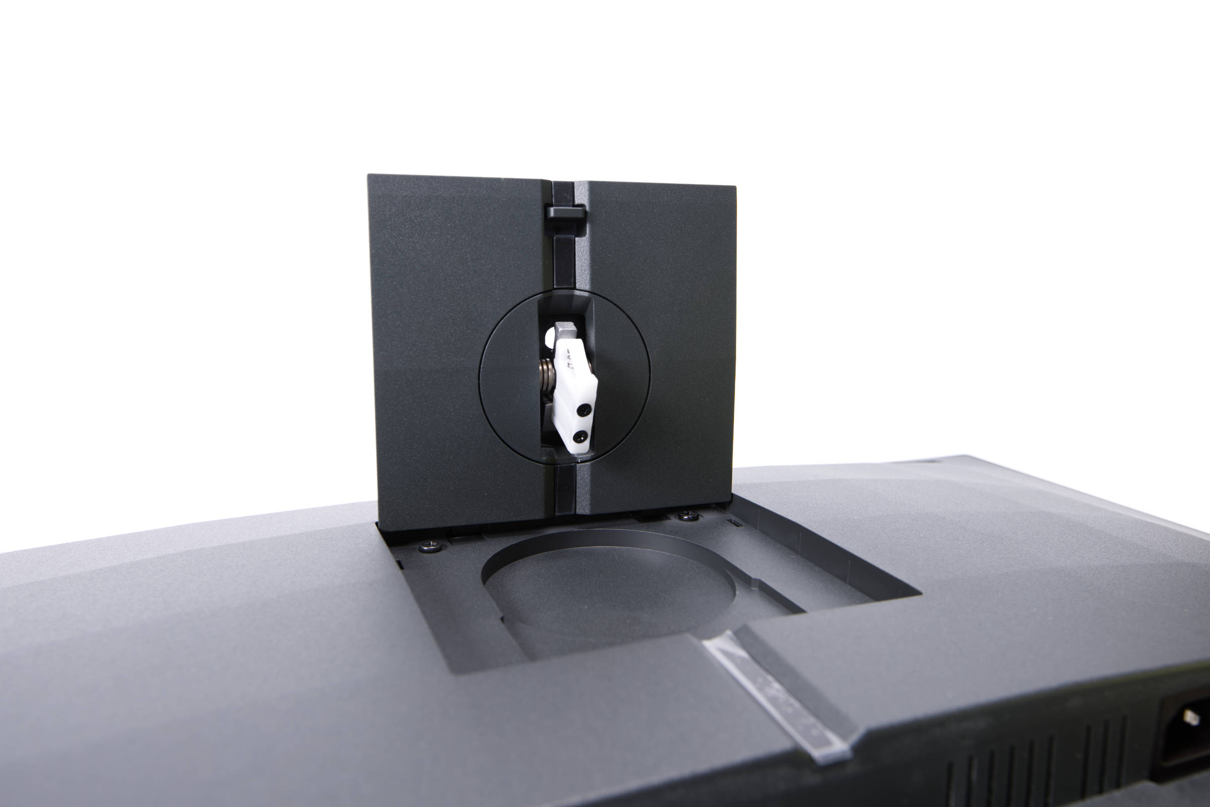 Der Standfuß wird einfach in den Monitor auf der Rückseite eingesteckt, wonach er in die weiße Halterung am Monitor einhakt.