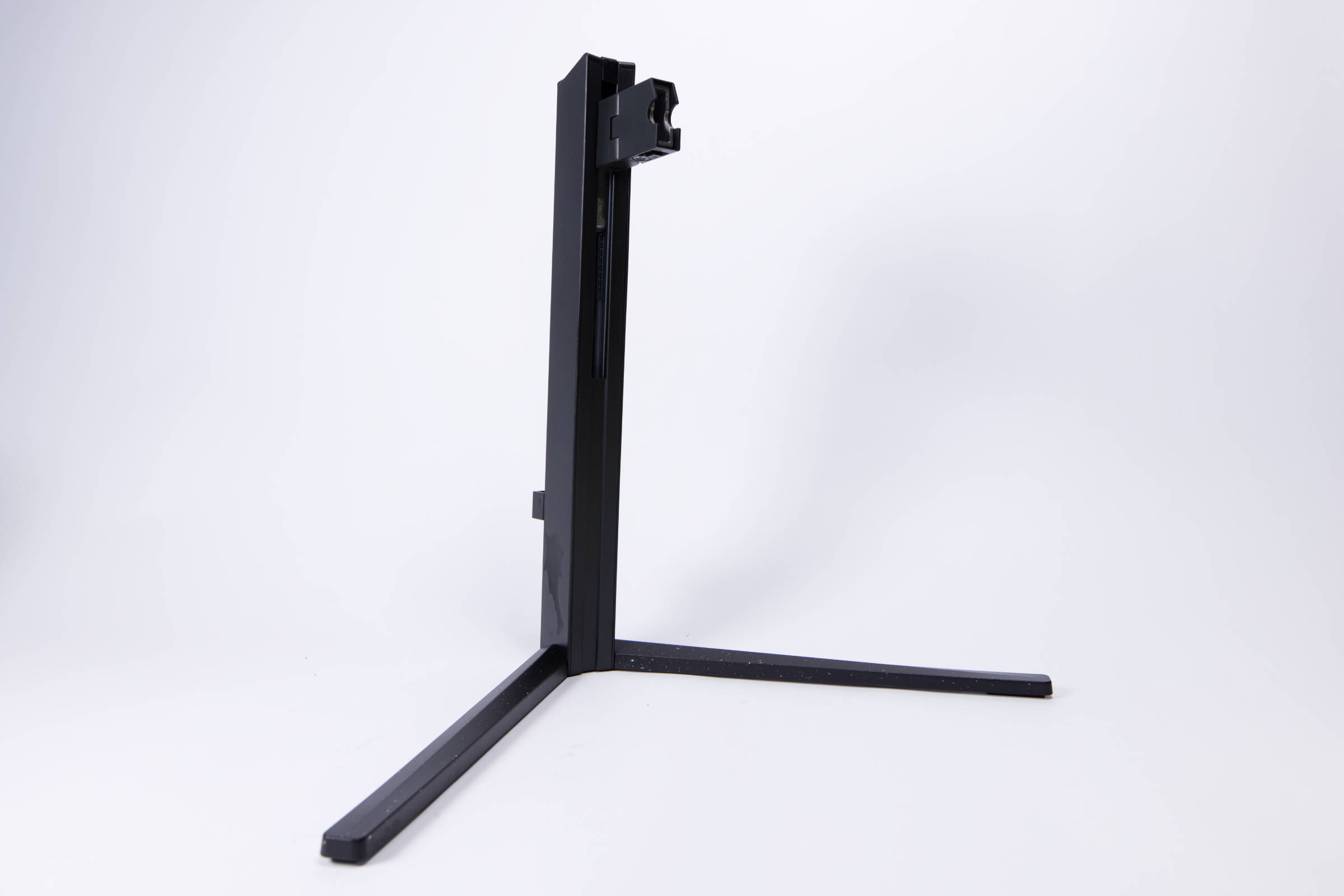 Der Fuß besteht aus zwei Teilen, die ineinander gesteckt werden. Der obere Teil ist eine durchgehende Stange und der untere ist ein V-förmiges Element, das von unten mit Metall verstärkt ist. Auf der Unterseite wird dann das obere Element mittels einer Schraube fixiert, die man ohne Werkzeug leicht festziehen kann.