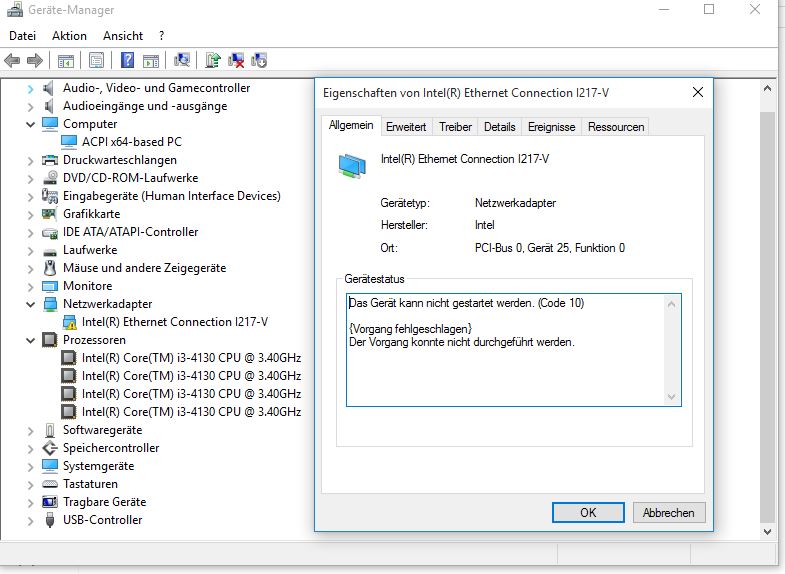 Die jeweiligen Felernachrichten aus dem Netzwerkcenter und dem Gerätemanager habe ich als Screenshots beigefügt.