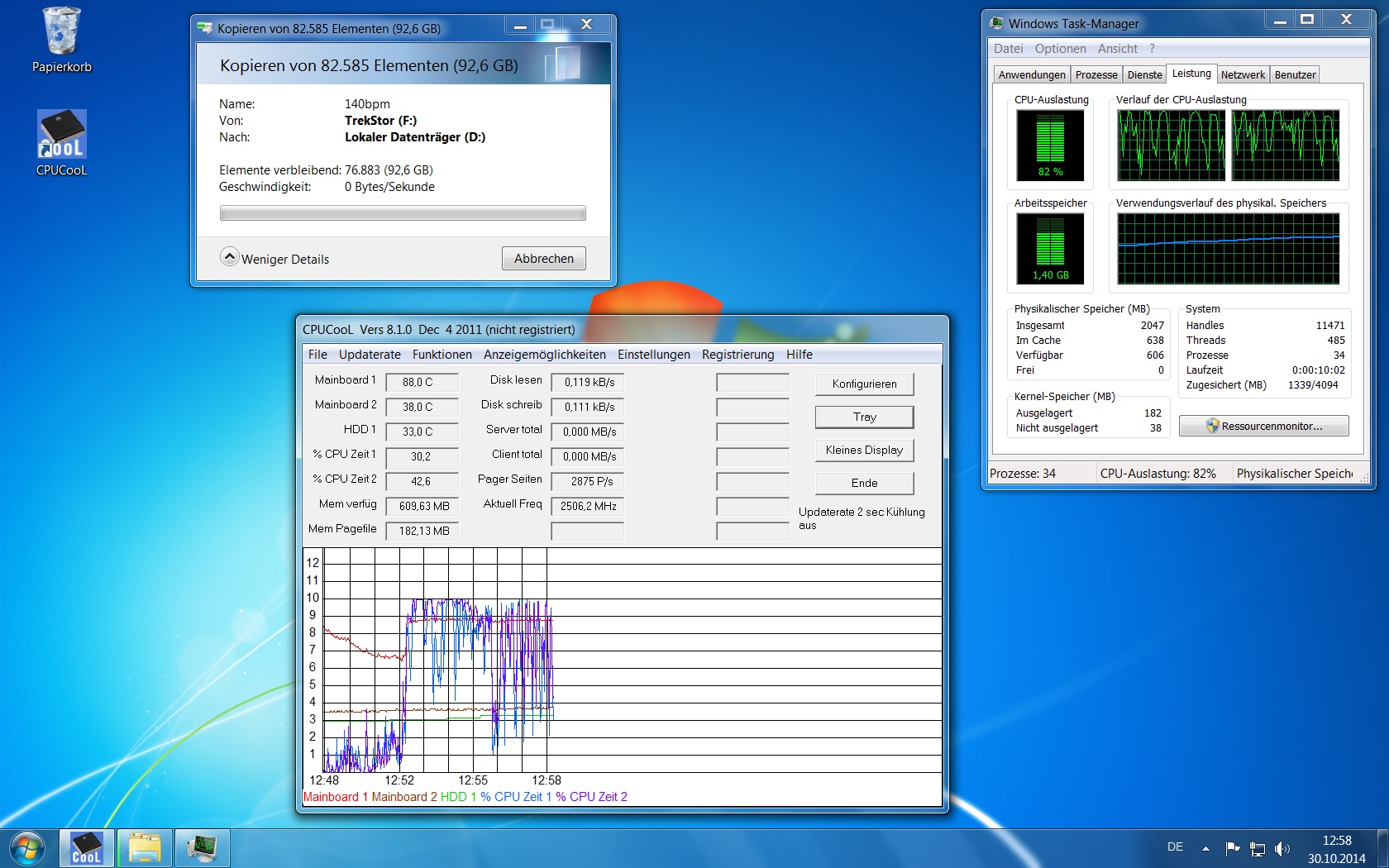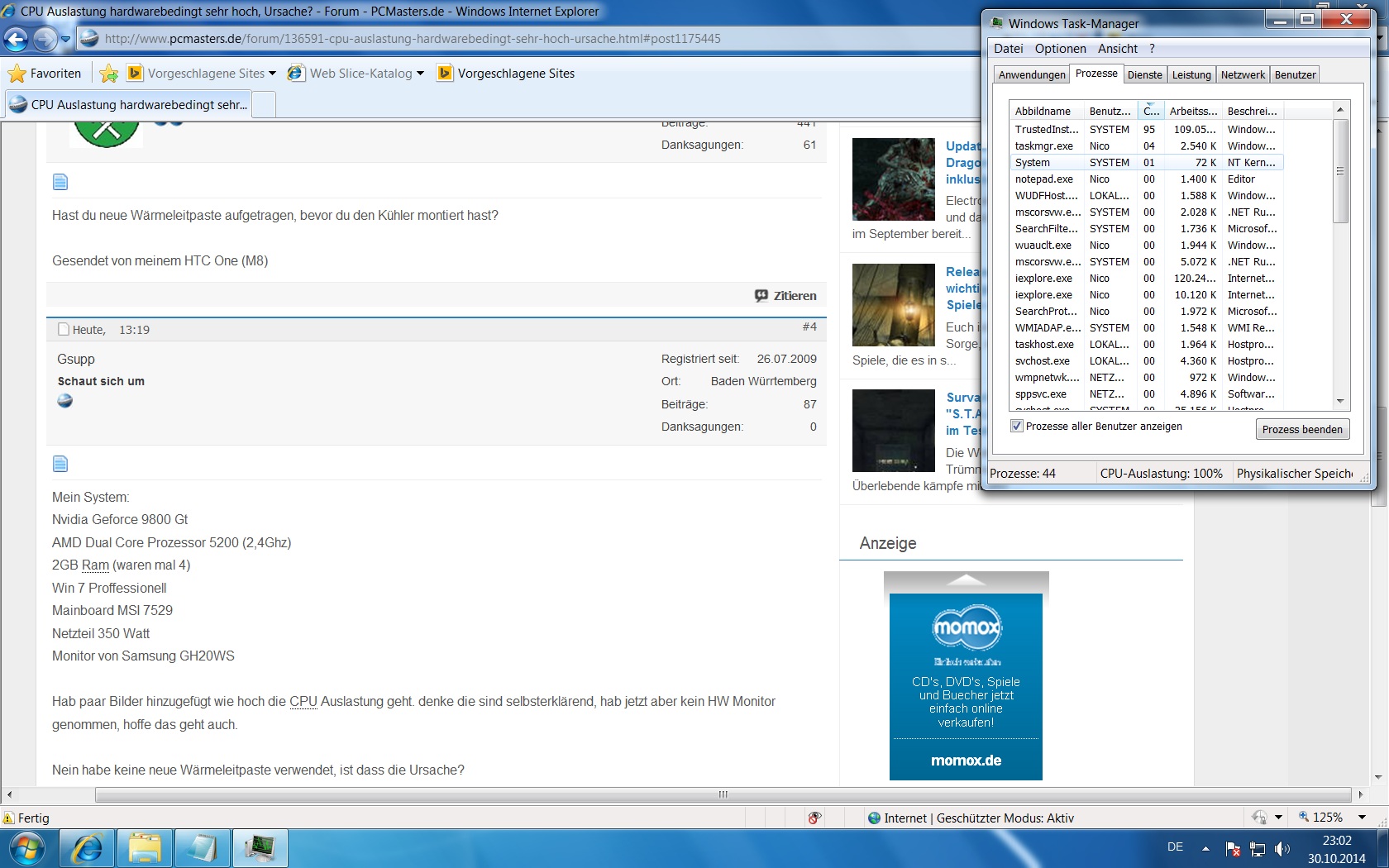ich hatte vor kurzem ein Problem mit meinem Arbeitsspeicher sodass ich jetzt nur noch 2 gb verwenden kann und der andere Slot auf dem Mainboard ist kaputt (MSI-7529). Auf jeden Fall werden die anderen 2gb nicht im Bios erkannt. Habe sogar noch einen anderen Ramriegel eingesetzt aber es scheint der Slot kaputt zu sein. Mir ist damals der Pc plötzlich bei einem Download eingefroren und habe heute den Pc formatiert und nochmal Win7 eingespielt. Jetzt habe ich gerade wieder die hohe CPU Auslastung festgestellt währenddem ich meine Daten von der Externen auf mein Laufwerk D kopiert habe und der Pc ist dann auch abgestürzt weil die Auslastung mehrere Minuten bei 100 % war. Automatische Updates lauften auch nicht im Hintergrund.