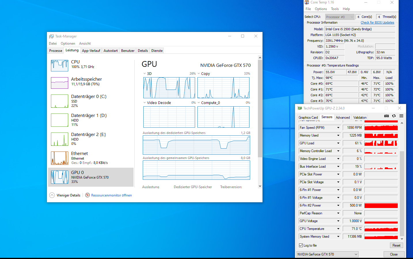 Ich hab auch gelesen, es könnte zu wenig Strom an der Hardware ankommen, aber da habe ich ja eigentlich nur die Kleine gegen die große SSD getauscht sowie die RAM Riegel getauscht, wobei beide Varianten 1.5 V brauchen. Auch die Temperatur von CPU und GPU habe ich mit CPU-Z bzw GPU-Z getestet und sie sind glaube ich nicht zu hoch. Siehe Screenshot "Temperaturen" bzw. GPU-Z Sensor Log.