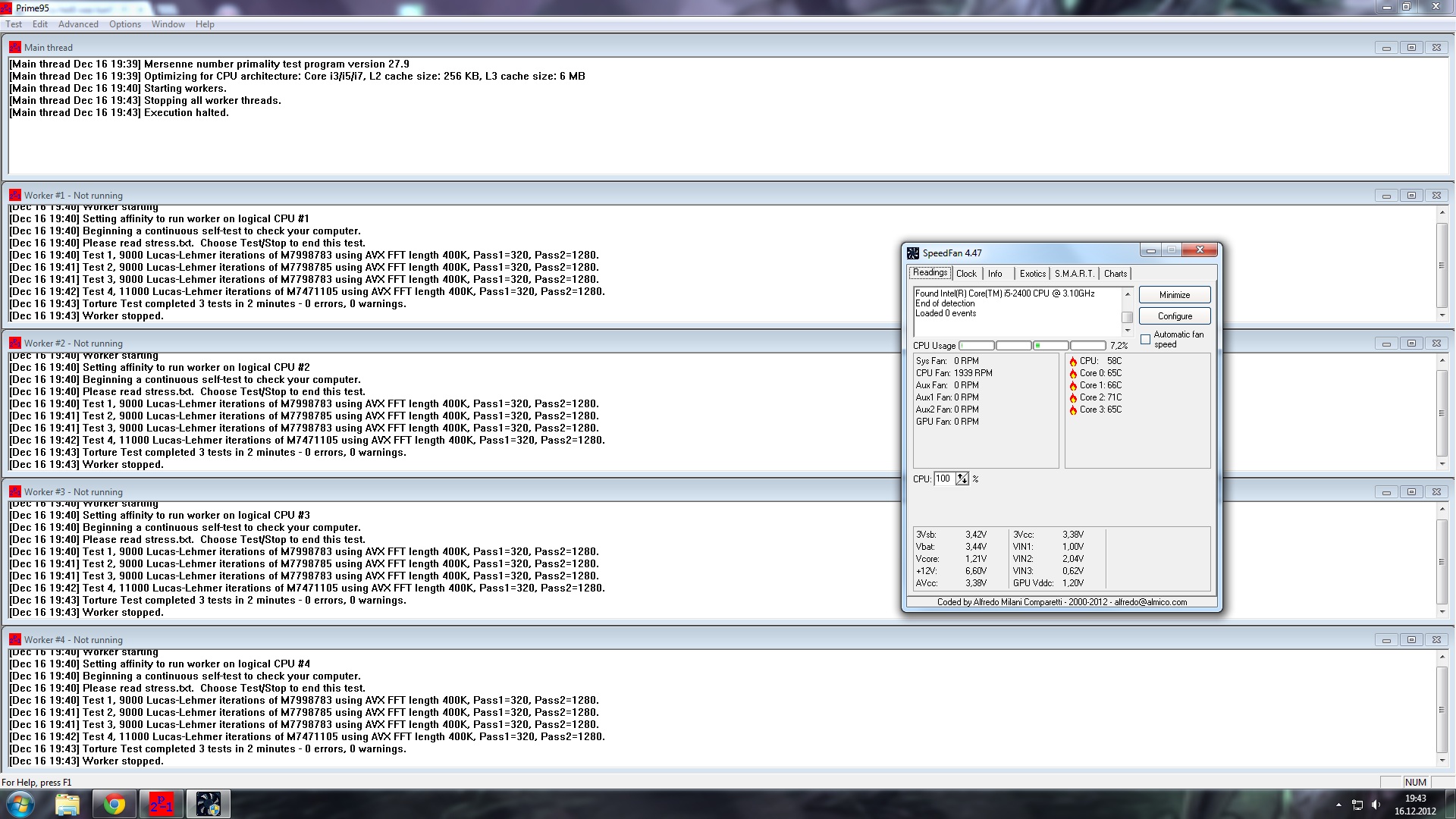 Wenn es sich bei den CPU-Temperaturen um Core-Werte handelt, sind die Werte für einen gerade ausreichenden Kühler (z.B. Box-Kühler) realistisch bei im Hintergrund laufenden Programmen. Der Lüfter dreht möglichst ruhig, und die Target-Temperatur für den Fühler im CPU-Sockel ist auf 65° eingestellt. ~15° dazu für die Kerne - der Lüfter ist unmittelbar vor dem Hochdrehen.
