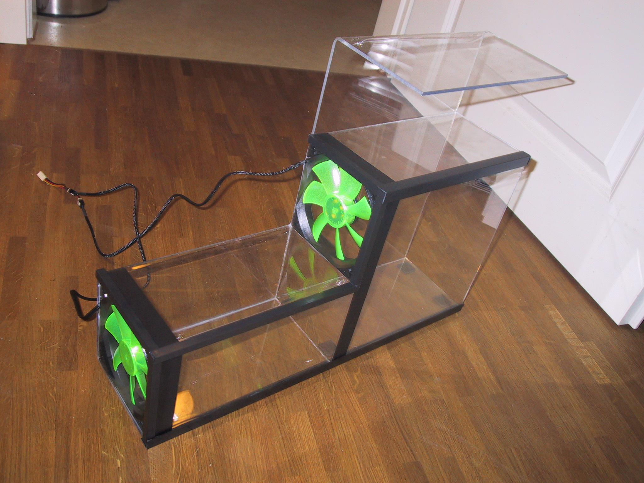 Du musst nur aufpassen, dass du den Luftausgang nicht direkt neben den Eingang setzt, sonst wird die warme Luft die rauskommt ja gleich wieder eingesaugt. Du könntest ja rechts oben und unten reinpusten lassen und links die warme luft rauslassen.