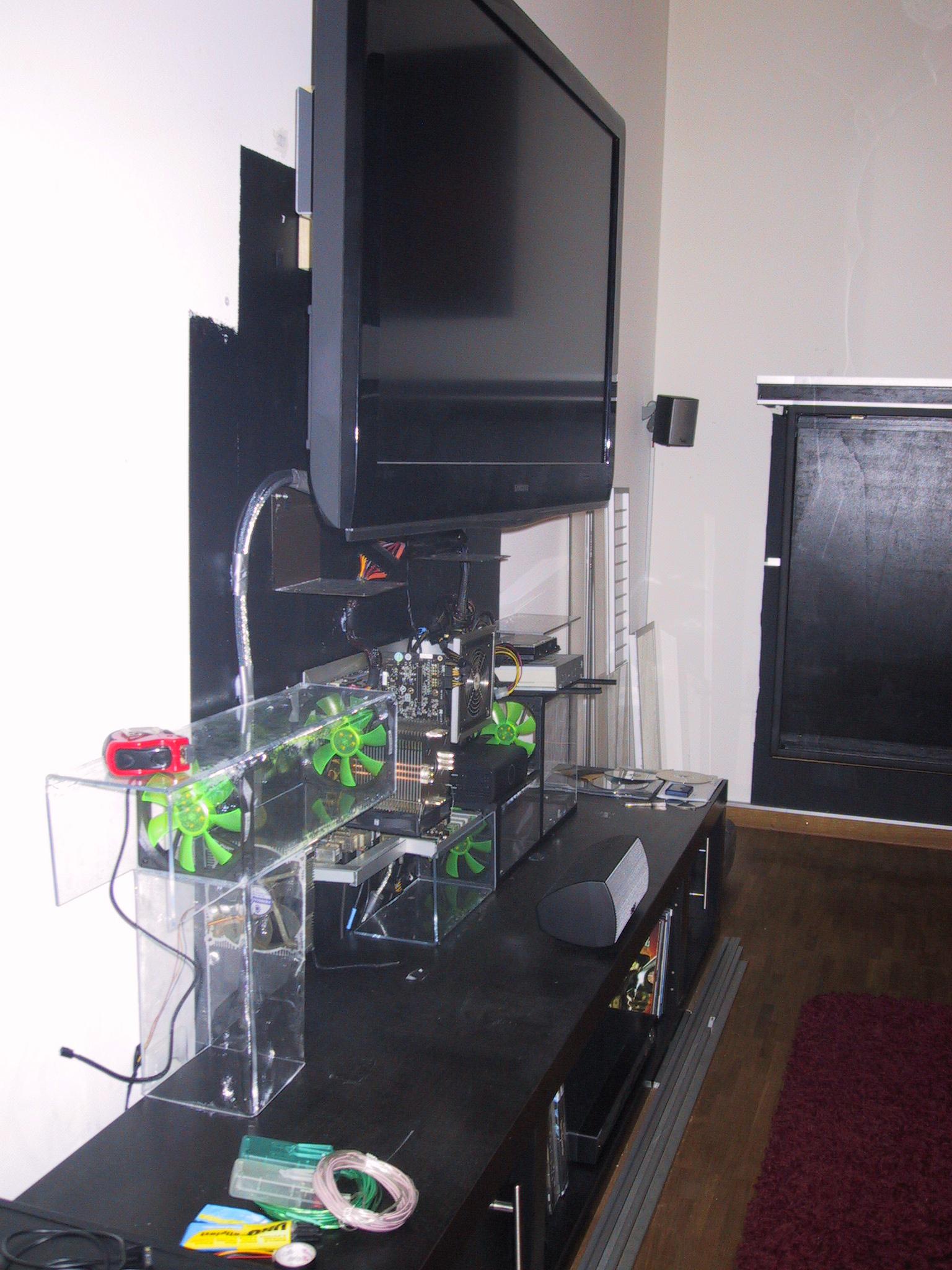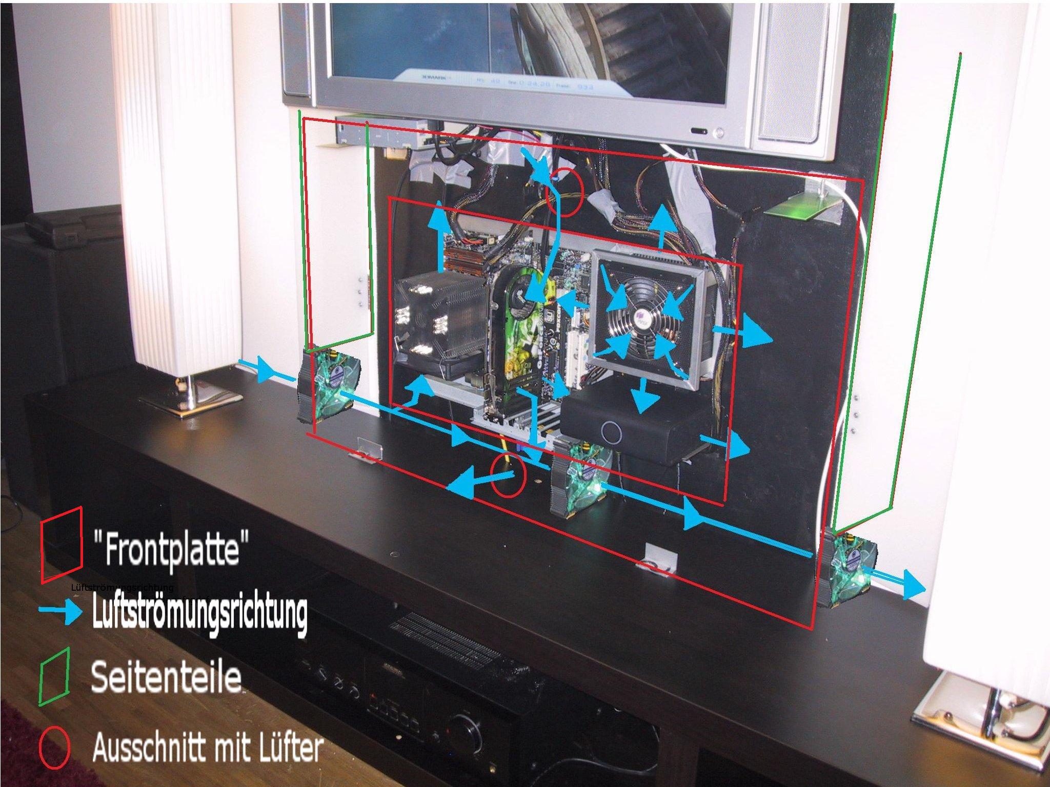 Auf einer Seite rein und auf der anderen Seite raus. (wie die Lüfter unten, nur reichen denke ich nur die äußeren) Du brauchst halt mind 4 Lüfter, wobei 6 sicher auch nicht verkehrt werden.