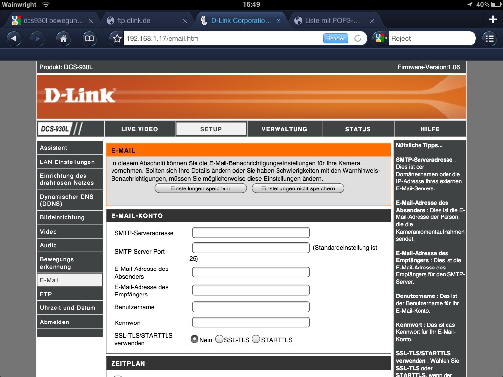 Das Ding hat einen Bewegungsmelder welchen ich aktivieren will wenn ich nicht da bin. Dazu muss ich meine Email Daten eingeben.