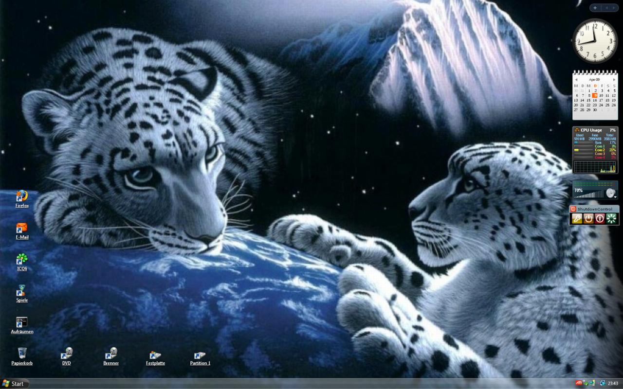 Ich mag es am liebstn wenn rein gar nichts, außer meiner enstprechenden konfogurierten RocketDock-Leiste auf meinem Desktop ist......, aber jedem das seine 😉