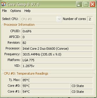 Also habe meinen E 6600 auf 3.02 Ghz übertaktet (lief davor auf 2,8 will aber mehr:bigok🙂 nach einer Stunde Orthos liegt die Temp bei bei Core Temp beider Kernen so von 50 bis 55 C° ist das noch akzeptabel??