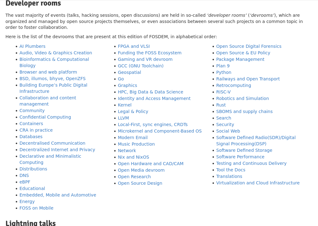 Every year, FOSDEM hosts a wide variety of activities. This page gives an overview with links to further information about scheduled events. All times CET (UTC+1). FOSDEM is a rather busy conference. This edition features 1071 speakers, 983 events, and 70 tracks. We do our best to provide you with as much information and navigation options about the schedule as we can.