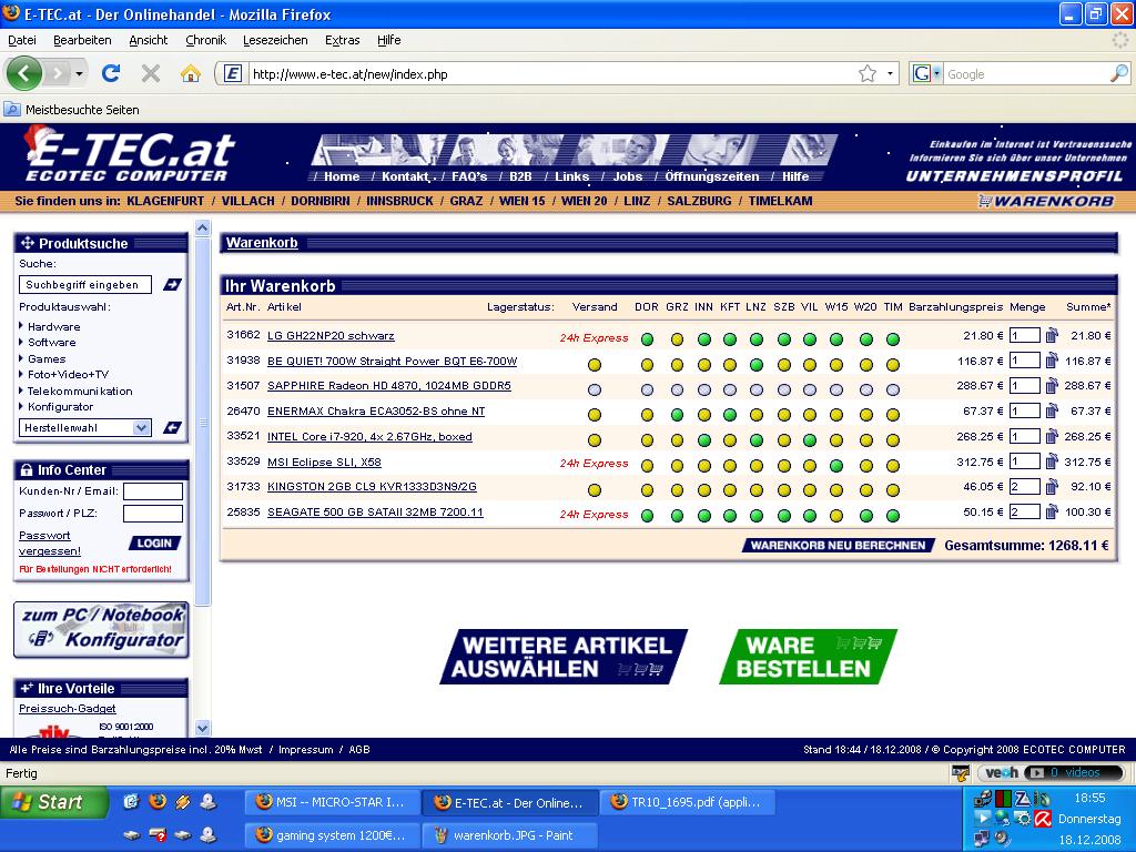 Meine Empfehlung nochmal an dich... warte bis Mitte Januar. Bis dahin ist die 295 GTX von Nvidia auf dem Markt und die Preise für die beiden Grafikbomben der beiden Hersteller sollten geringer ausfallen als zur Zeit. In einen 1200 Euro PC gehört einfach das Beste, was zur Zeit auf dem Markt erhältlich ist.