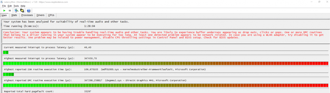 LatencyMon has been analyzing your system for 1:28:04 (h:mm:ss) on all processors.
