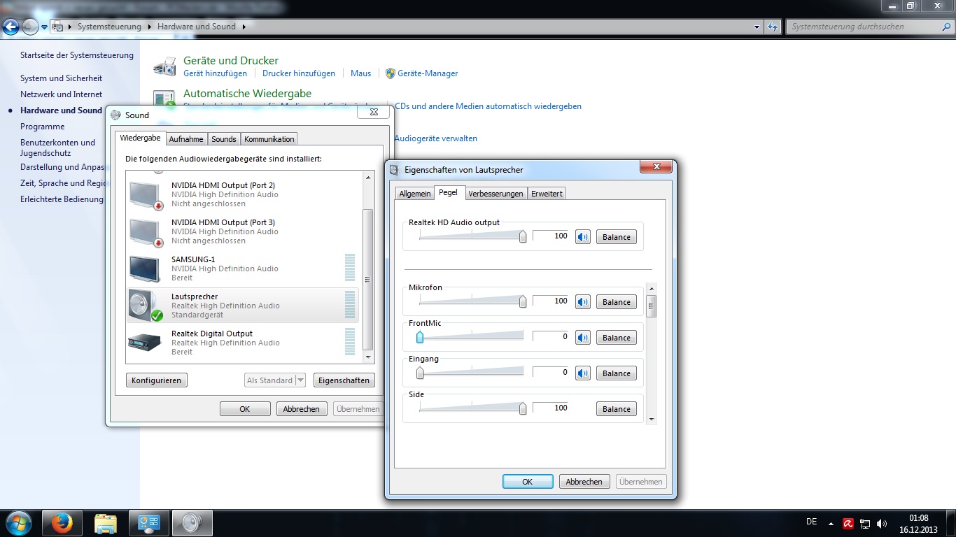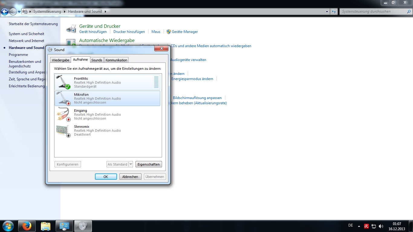 Im 1. Bild Doppel-Klick auf Frontmic, da kommst du auf das Bild fürs Frontmic wie bei mir fürs Mikrofon, wo du die Regler für den Eingangspegel hast. Auf dieses Signal müßten die Anwendungen zugreifen, unabhängig vom Wiedergabe-Signal an deine Lautsprecher/Kopfhörer.