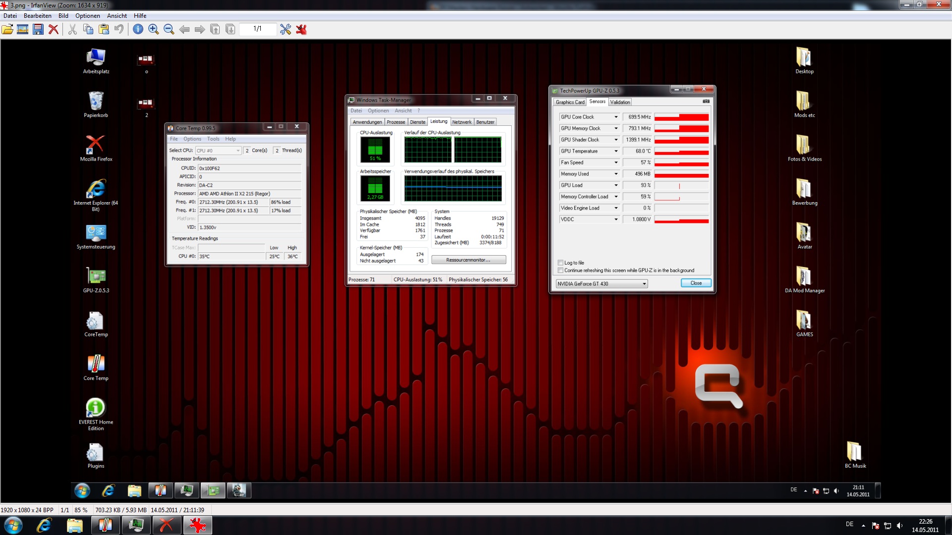 Jetzt werd ich mir erstmal schön 2. Fussball Bundesliga reinziehen, aber ich werde heute Nachmittag/Abend mal einen etwas längeren und anspruchsvolleren Test machen. Dann versuche ich mal Systemfordernde Spiele wie Crysis 2, GTA IV usw über einen langen Zeitraum zu spielen. Hab aber irgendwie trotzdem Schiss vor dem Ergebnis, schließlich erscheint in ein paar Tagen The Witcher 2 und verdammt, da muss alles laufen wenn du verstehst 🙂