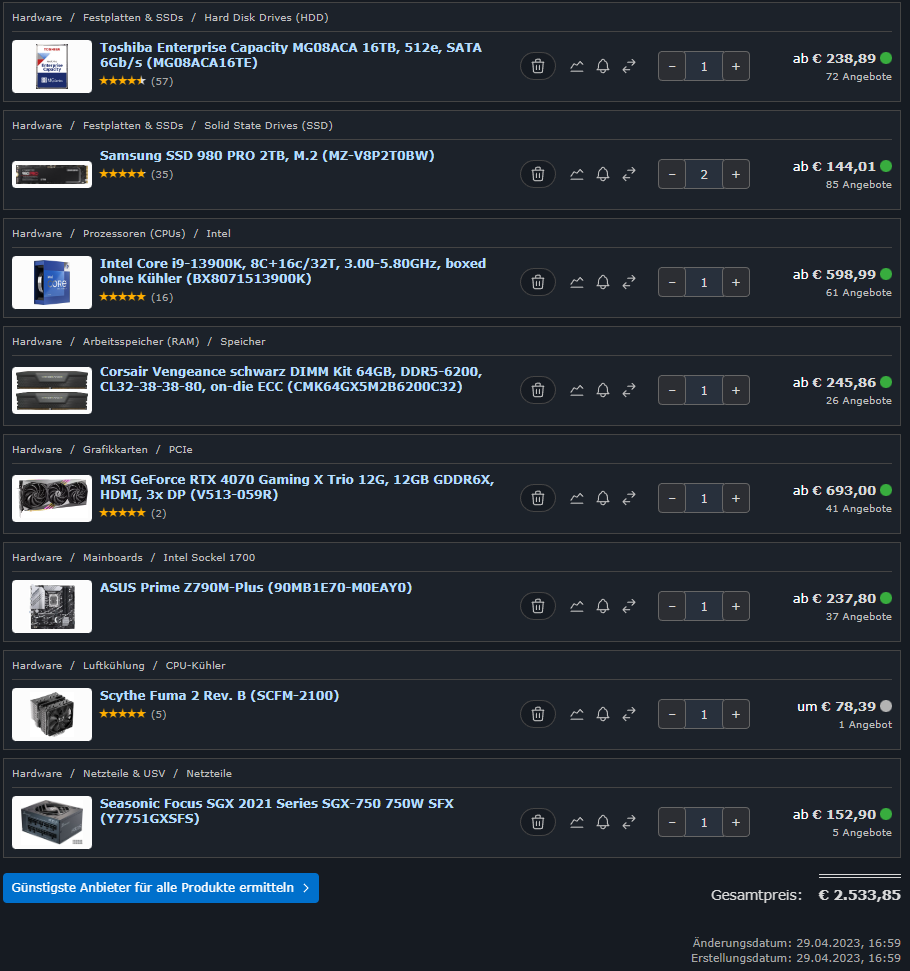 Nur als Beispiel, ich nutze ein normales Midi-Tower-Case, welches im Vergleich deutlich größer ist. Mein CPU Kühler ein NH-D15 schließt dennoch mit der Seitenwand ab. Das liegt daran, dass schneller RAM ebenfalls Kühlkörper drauf hat, das hat die Folge, dass der Lüfter des Kühlers höher montiert wird, das dann wiederum die tatsächliche maximale Höhe entsprechend beeinflusst und vergrößert. Das wird bei dir vermutlich auch nochmal etwas sein, was zu berücksichtigen ist. Somit ist vermutlich auch der FUMA keine Option, oder man muss mit einem Lüfter weniger arbeiten. Was in Anbetracht der Tatsache, dass ein 13900K verbaut werden sollte, eine ziemlich blöde Idee ist.
