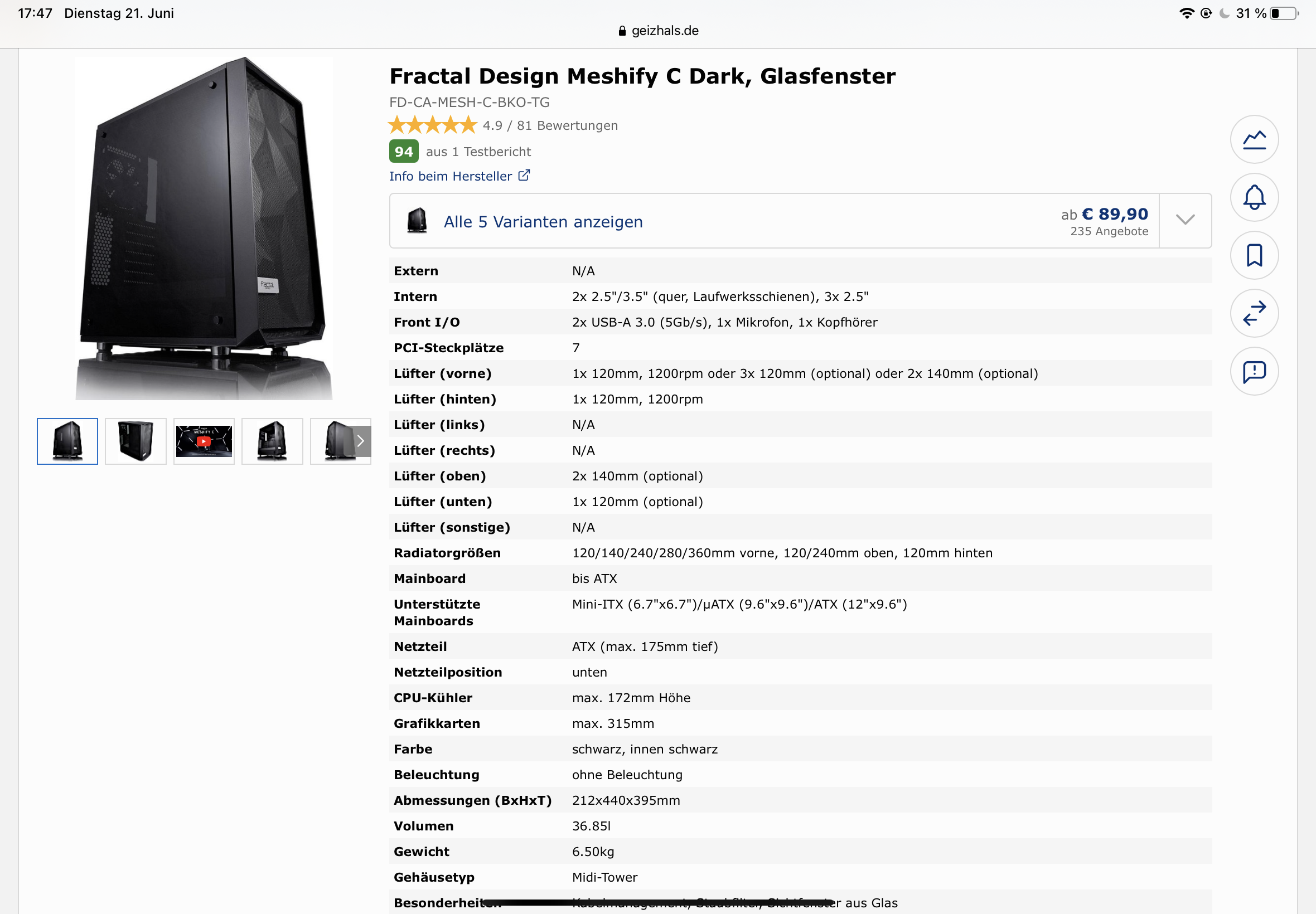 Dein Gehäuse hat darüber hinaus nicht den besten Luftdurchsatz (Airflow). Es ist vorne quasi geschlossen und bietet wenig bis keinen Zugang zu Frischluft. Selbiges gilt für die Oberseite.