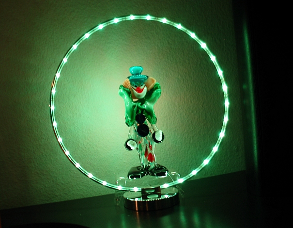 Mein vor 2-3 Wochen gekaufter LED-Ring ist eingetroffen. Ganz spassig zusammen mit Glaskunst, die auf diese Weise wechselfarbig beleuchtet wird.
