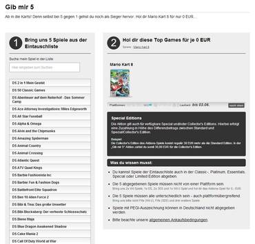 - Die 5 Spiele müssen alle unterschiedlich sein - auch plattformübergreifend. Also nicht Fifa (Wii U), Fifa (3DS) und drei weitere Spiele