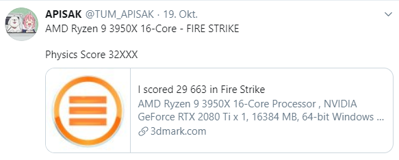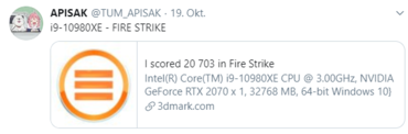 Ryzen 9 3950X: Gigabyte X570 Aorus Elite Mainboard, 16 GB Arbeitsspeicher und eine GeForce RTX 2808 Ti Core i9-10980XE: Asus wS X99 Sage/10G Mainboard, 32 GB Arbeitsspeicher und eine Asus GeForce RTX 2070. Und auch wenn das alles sehr spannend klingt: Benchmarks für unveröffentlichte Hardware sind mit Vorsicht zu genießen! Der mit dem Intel-System erreichte Score ist aktuell nicht online abrufbar, der AMD-Wert allerdings schon. Beide Werte wurden durch den Twitter-Nutzer "@TUM_APISAK" veröffentlicht.: