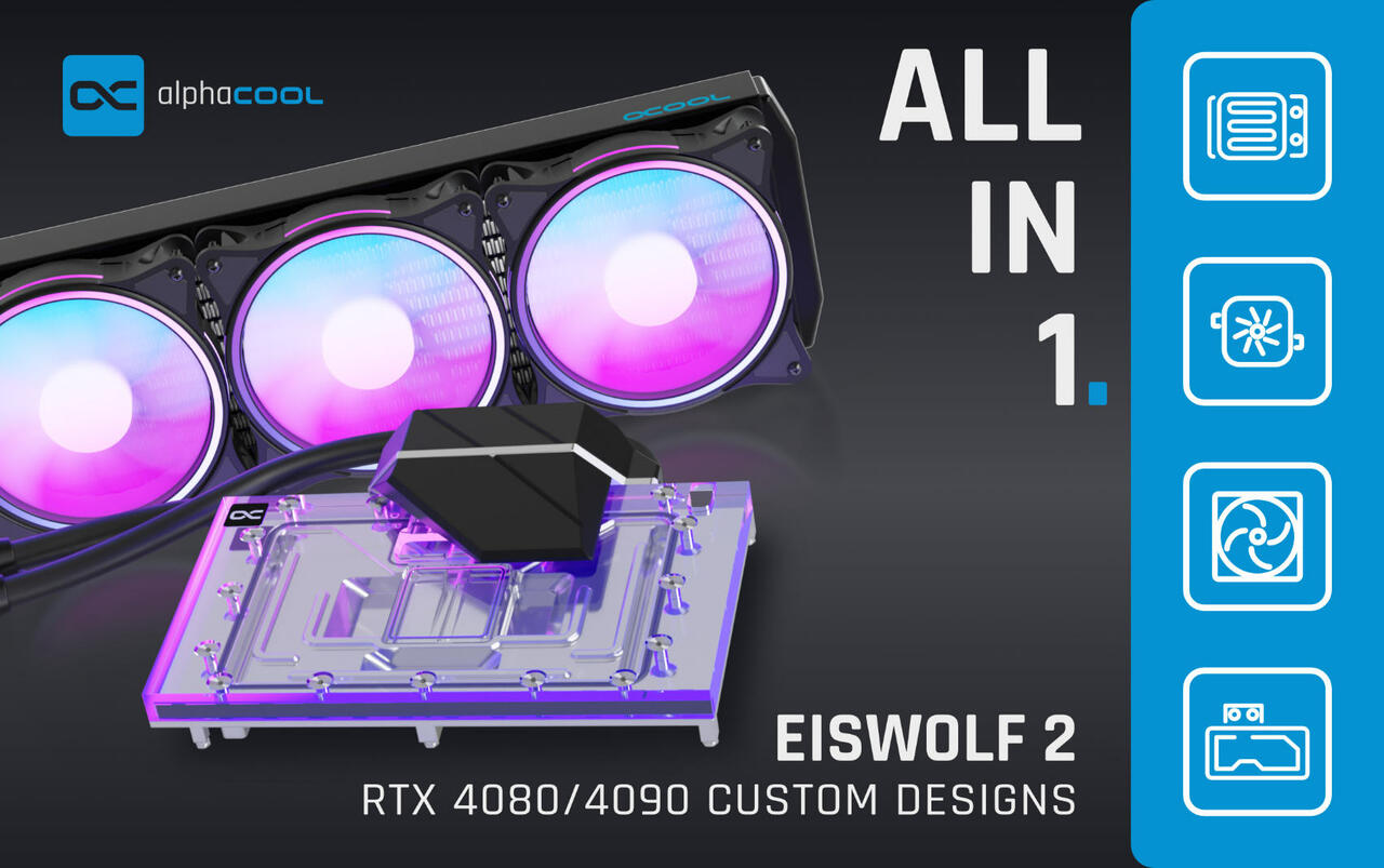 Der Alphacool Online Shop nimmt derzeit Vorbestellungen für den Eiswolf 2 AIO - 360mm RTX 4090 GameRock + Phantom, Eiswolf 2 AIO - 360mm RTX 4090 Aorus Master - Gaming, und Eiswolf 2 AIO - 360mm RTX 4090 AMP entgegen. Für die RTX 4080 Reference Design, RTX 4090 Founders Edition und RTX 4090 Suprim ist der Eiswolf 2 AiO bereits im Handel erhältlich.