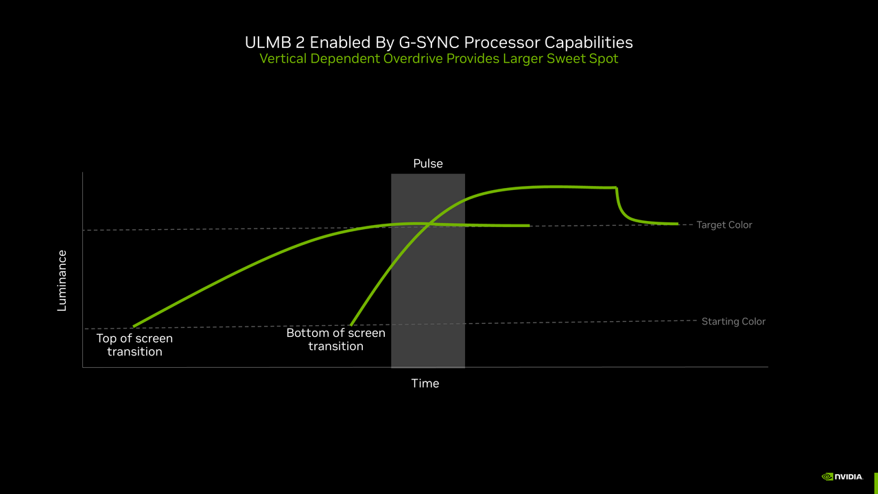 Die Lösung dieses Problems unterscheidet ULMB 2 von G-SYNC von anderen Backlight-Strobing-Methoden: G-SYNC ermöglicht es uns, die Reaktionszeit entsprechend der Position der vertikalen Abtastung zu regulieren, wodurch sichergestellt wird, dass sich die Pixel auf dem gesamten Bildschirm genau zum richtigen Zeitpunkt auf der richtigen Höhe befinden, damit die Hintergrundbeleuchtung blinken kann. Wir haben dies "Vertical Dependent Overdrive" genannt.