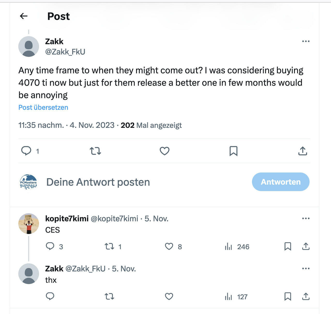 Der Nutzer Kopite7kimi hat sich bisher als zuverlässige NVIDIA-Leaks-Quelle erwiesen. Mit einer kurzen Antwort hat er womöglich den Launch der neuen Grafikkarten bekannt gegeben. Auf der Fachmesse Consumer Electronics Show (CES) werden oft neue Produkte vorgestellt und auch NVIDIA hält im Rahmen der Konsumermesse meist eine Pressekonferenz.