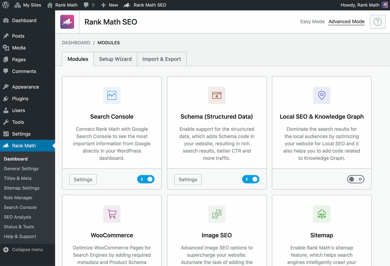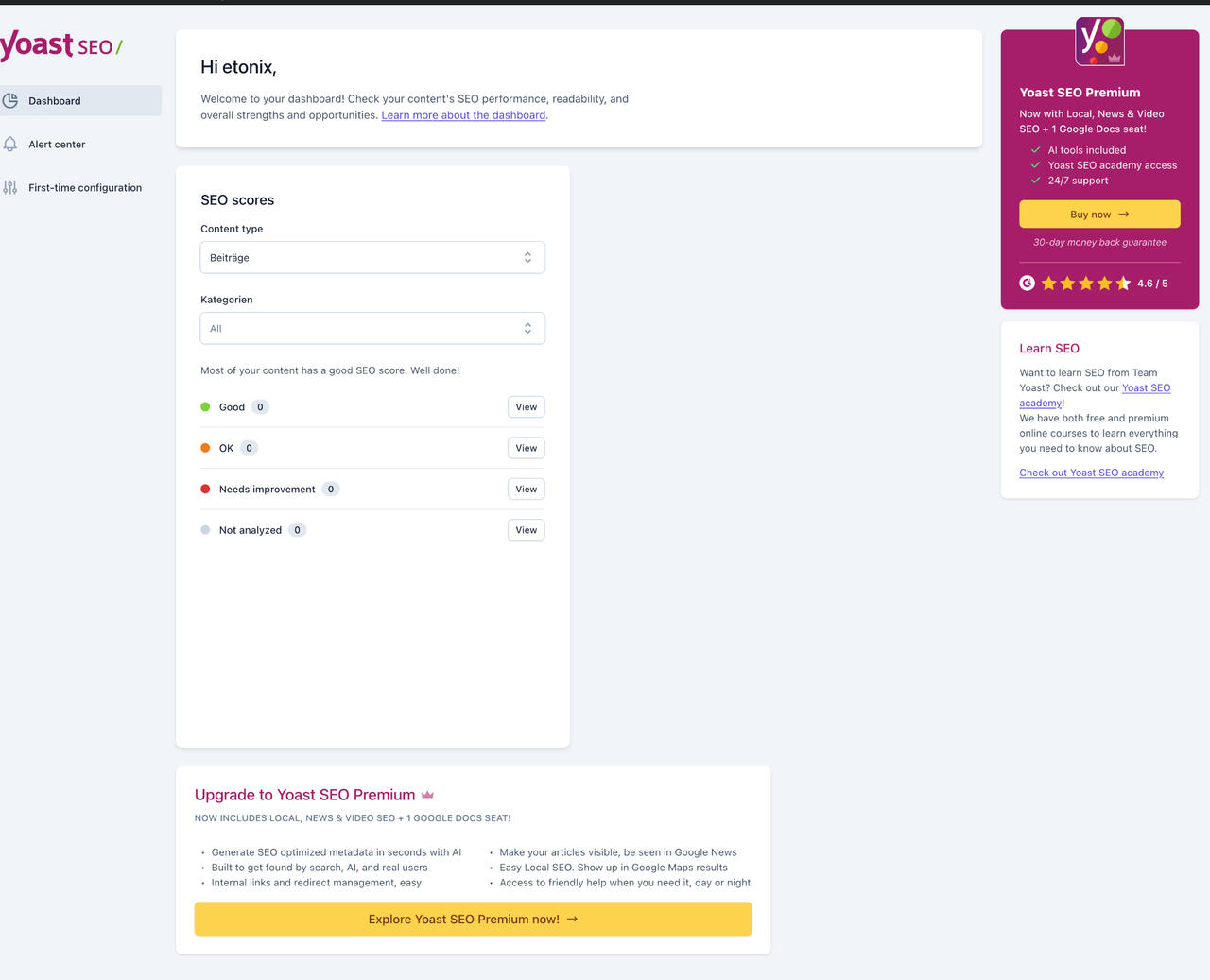 - Setup-Assistent: Der Installationsassistent überprüft Ihre Website und wendet empfohlene Standardeinstellungen für SEO-Grundlagen, Social-Media-Profile und Webmaster-Verifizierungen an, sodass Sie in wenigen Minuten einsatzbereit sind.