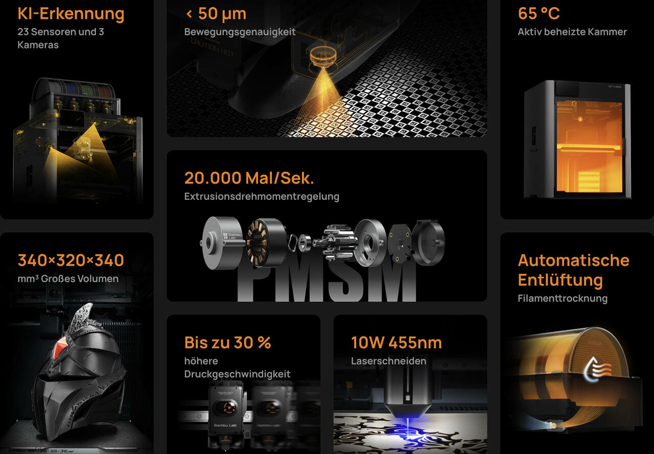 Eine Sensorsuite mit 23 Eingängen und drei integrierten Kameras speist eine KI-basierte Bildverarbeitung, die häufige Probleme wie Fadenbildung oder Blob-Bildung erkennt und die Startparameter vor der ersten Schicht überprüft. Die aktive Schwingungsdämpfung sorgt für eine gleichbleibende Oberflächenqualität bei höheren Geschwindigkeiten, während die automatische Loch- und Konturkompensation dazu beiträgt, dass die Teile näher an den Nennmaßen landen. Die Wartung wird durch einen werkzeuglosen Düsenwechsel optimiert, der nur wenige Sekunden dauert.