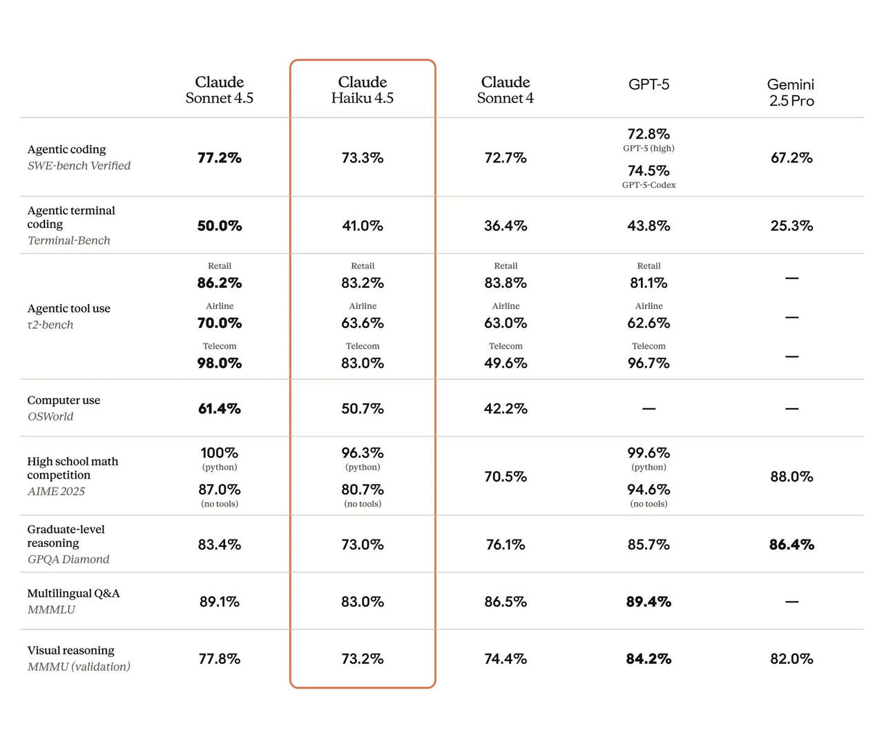 Haiku 4.5 erzielt in beliebten Benchmarks starke Werte und bietet eine nahezu bahnbrechende Codierungsleistung, wobei seine besonderen Stärken in der Behebung von Fehlern in der Praxis und bei Repository-Aufgaben liegen. Die Unterlagen von Anthropic heben die Parität mit Sonnet 4 bei mehreren Codierungsmetriken und die überlegene Leistung bei bestimmten Tool-Aufgaben hervor, was seine Eignung für Agenten unterstreicht, die Aktionen zuverlässig ausführen müssen.