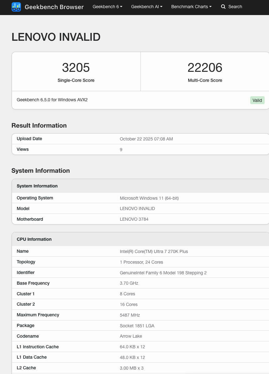 In Geekbench 6 erreicht der mutmaßliche 270K Plus 3215 (Single-Core) und 22.720 (Multi-Core). Diese Zahlen stimmen weitgehend mit den offiziellen Rankings für den Ultra 9 285K überein, was die Vermutung bestätigt, dass es sich bei diesem Muster um einen ähnlichen Siliziumschnitt mit unterschiedlicher Positionierung handeln könnte.