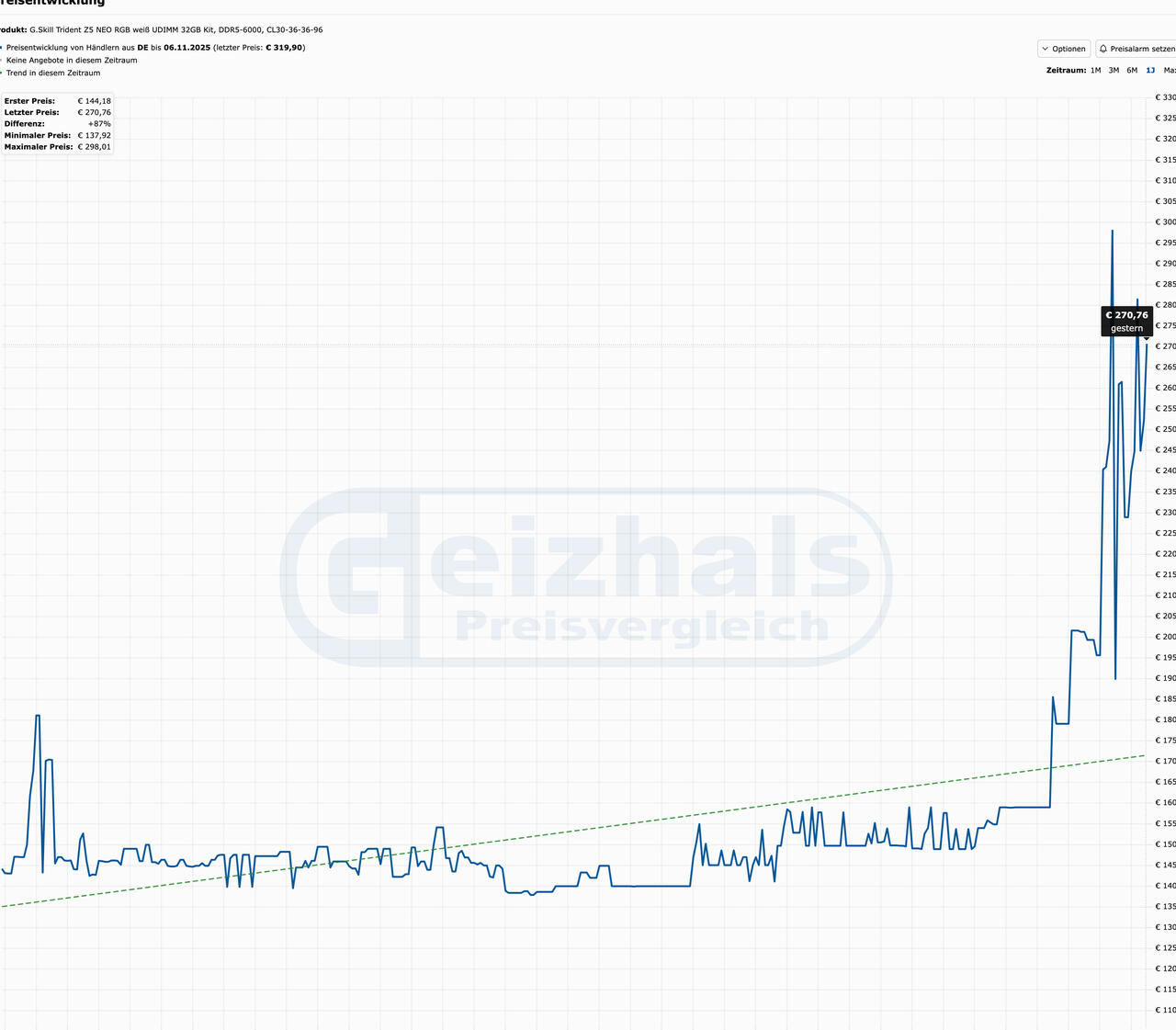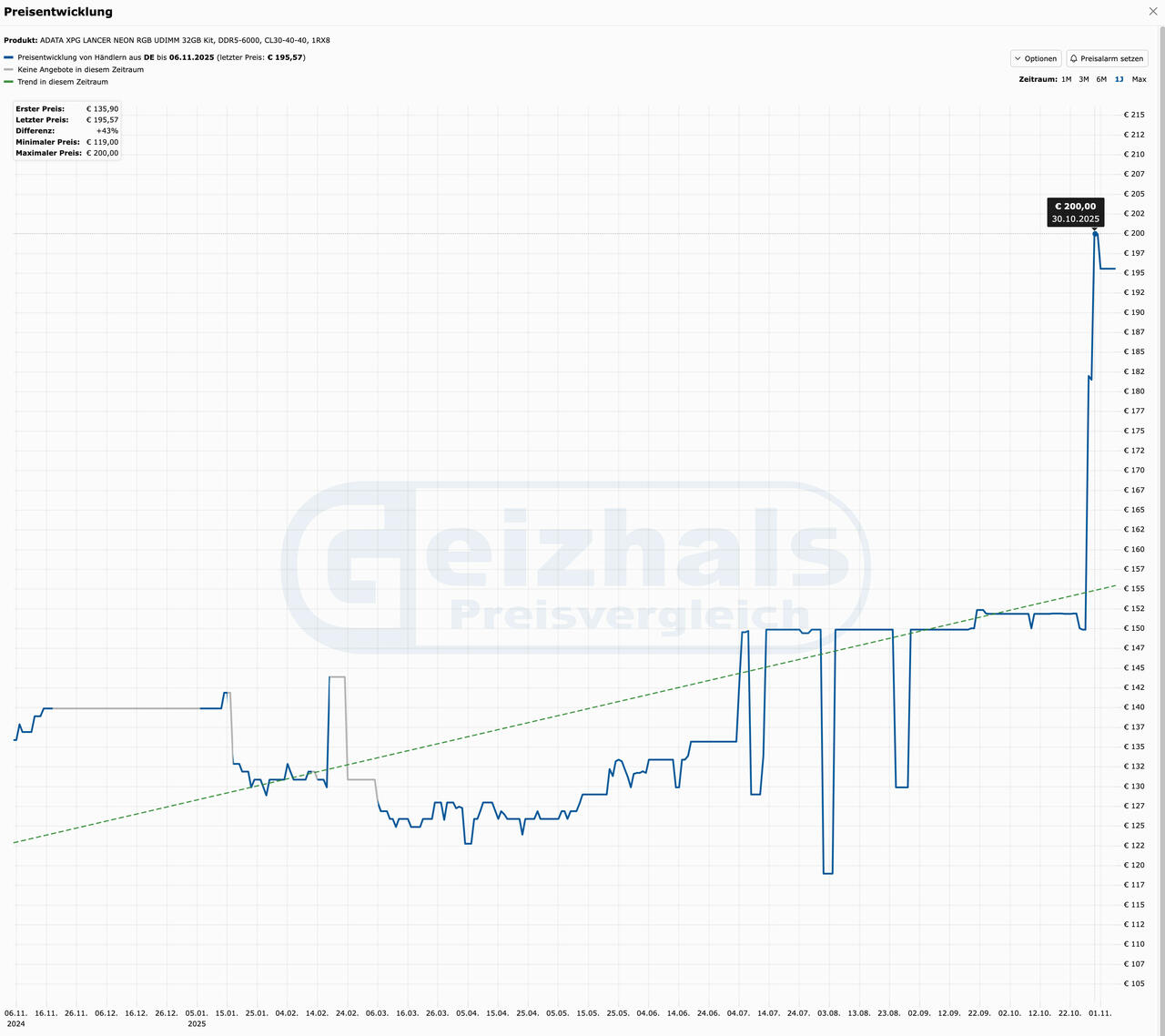 Die Krise ist in den Regalen der Verbraucher sichtbar. Preisvergleichsportale zeigen, dass ein G.Skill Trident Z5 Neo RGB 32 GB Kit (DDR5-6000 CL30), das kürzlich noch bei 159 € lag, jetzt bei rund 319 €, oder im Falle des ADATA XPG LANCER NEON RGB 32GB Kits (DDR5-6000), das kürzlich noch 150 € kostet und nun bei 195 EUR liegt.