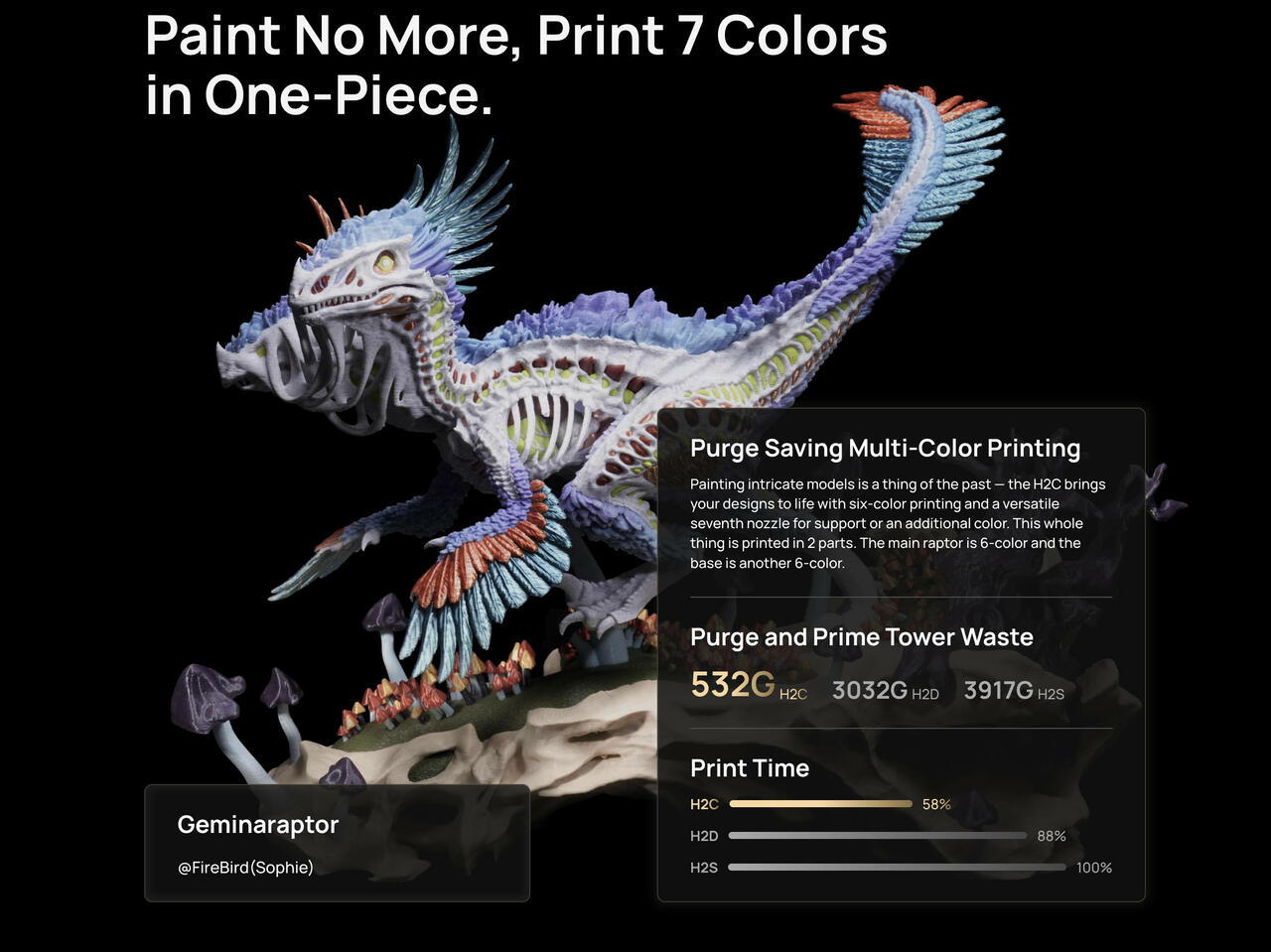 Herkömmliches mehrfarbiges FDM erfordert häufige Reinigungen, die die Kosten und die Druckzeit in die Höhe treiben. Die Zahlen von Bambu zeigen, dass die H2C-Reinigungs-/Vorbereitungsabfälle bei 532 g für ein komplexes Testmodell liegen, gegenüber 3.032–3.917 g bei vergleichbaren Konfigurationen. Die Druckdauer zeigt ähnliche Effizienzsteigerungen: