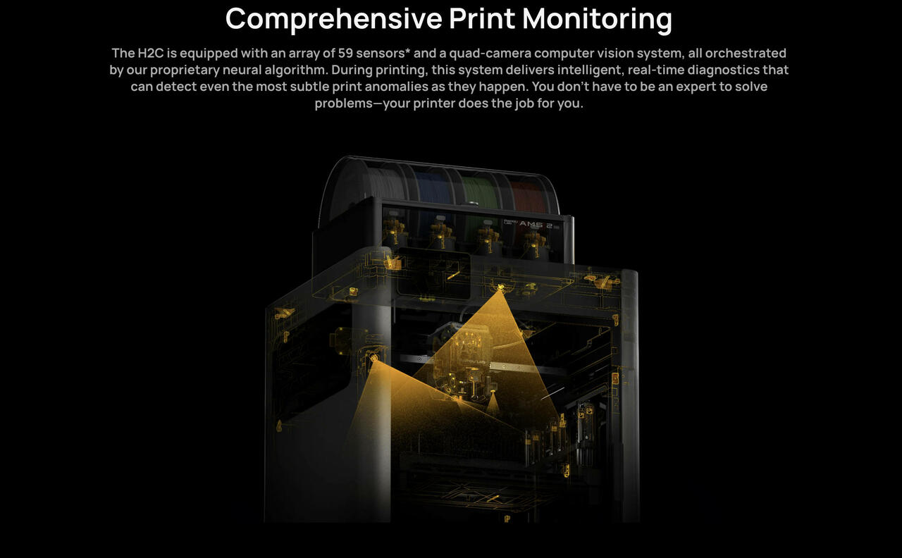 Bambu hat 59 integrierte Sensoren und ein Vierfach-Kamera-Computervisionssystem für Vorabprüfungen und Echtzeit-Anomalieerkennung – von Materialansammlungen bis hin zu Extrusionsabweichungen. Das Gehäuse selbst ist flammhemmend und verfügt über eine dreistufige Filterung (G3-Vorfilter, H12 HEPA, Aktivkohle), um Partikel und Gerüche zu reduzieren, die bei technischen Filamenten häufig auftreten.