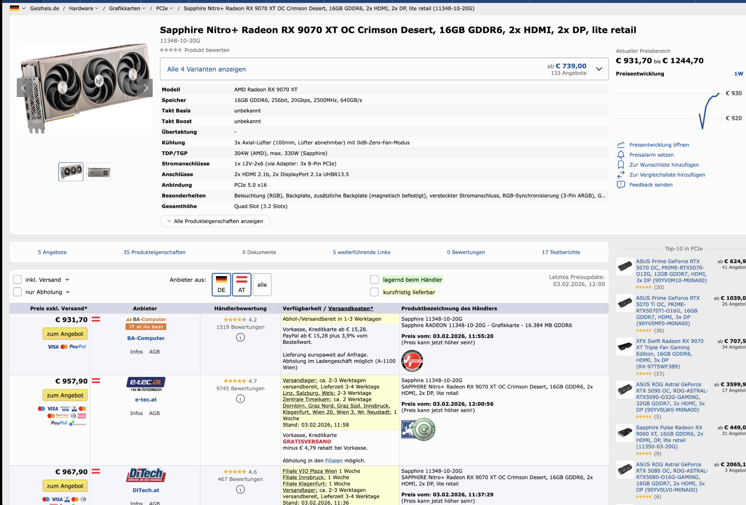 Die Radeon RX 9070 XT NITRO Crimson Desert Edition ist für 927 € gelistet worden und es gibt bereits andere Shops, die die neue Karte für 931 bis 985 € aufgenommen haben.