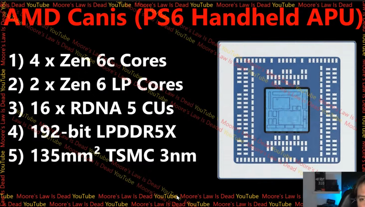 Darüber hinaus gab Moore's Law is Dead Einblicke in die PS6-Handheld-Konsole, die mit AMDs „Canis”-APU ausgestattet sein wird. Dieser fortschrittliche Prozessor verfügt über vier Zen 6c-Kerne und zwei Zen 6 LP-Kerne, um Betriebssystemaufgaben effizient zu verwalten. Das Handheld-Gerät wird außerdem mit 16 RDNA 5 CUs mit einer Frequenz von 1,6-2 GHz ausgestattet sein, wobei die Gesamtleistungsaufnahme der Platine 15 Watt beträgt. Das System wird von einem LPDDR5X-Speicher über einen 192-Bit-Bus gespeist und zielt auf 1080p-Gameplay mit verbesserten Funktionen ab, wenn es angedockt ist.