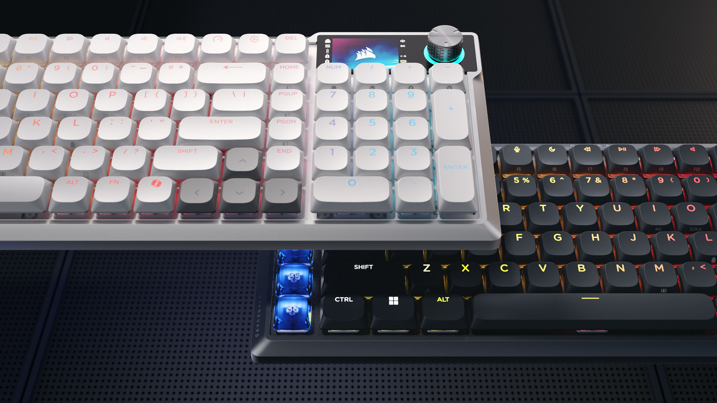 Das VANGUARD AIR 99 WIRELESS verfügt über die optisch-mechanischen Schalter von Corsair, die eine schnelle Auslösung bieten. Die Tastatur bietet zudem Hyper-Polling mit 8.000 Hz, FlashTap-SOCD-Verarbeitung und drei Verbindungsmodi, darunter 2,4-GHz-SLIPSTREAM-WLAN, Bluetooth und USB-A-Konnektivität.