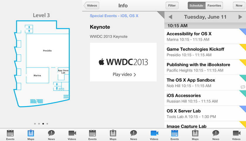 Die offizielle WWDC-App ist ab sofort im App Store für iPhone, iPod touch und iPad kostenlos verfügbar. Sie soll den Besuchern auf der WWDC mithilfe von Passbook-Integration helfen die Tage während der Ausstellung zu planen. In der App werden ein Kalender mit allen Terminen zu Präsentationen und Keynotes, eine übersichtliche Karte des Gebäudes und Videos von Präsentationen bereitgestellt. Auch die vergangenen Präsentationen aus den letzten Jahren können angesehen werden. Dabei wird auch die iCloud-Synchronisation verwendet, um ein angefangenes Video nahtlos an einem anderen iDevice weitersehen zu können.