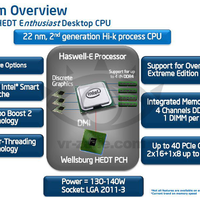 Diesen Weg geht Intel mit überarbeiteten Desktop-Modellen bestimmt, doch deutlich spannender dürften allerdings die Haswell-E-CPUs, die insbesondere für Gamer und Übertakter gedacht sind. Die in 22 nm Hi-k gefertigten Prozessoren sollen sowohl als Sechs-Kern-Variante als auch als Acht-Kern-Modell erhältlich sein und bis zu 20 MB Cache besitzen. Da Intels Hyper-Threading natürlich nicht fehlen darf, besitzen die Prozessoren somit bis zu 16 Kerne; auch wenn acht davon nur virtuell zur Verfügung stehen. Der integrierte Speichercontroller unterstützt DDR4-RAM mit 2.133 MHz und es gibt insgesamt bis zu 40 PCIe-Lanes (die der dritten Generation). Die TDP der neuen Haswell-E-Prozessoren gibt Intel auf den Folien mit 130 bis 140 Watt an, als Sockel kommt der LGA 2011-3 zum Einsatz. Intel verzichtet bei den High-End-Modellen auf eine integrierte GPU, weil sich Anwender, die sich für diese CPUs interessieren, ohnehin nicht mit einer integrierten Grafiklösung zufrieden geben werden.
