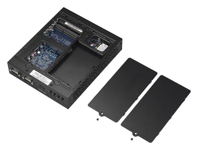 Das Stahlgehäuse selbst bietet Platz für ein 2,5-Laufwerk, zwei RAM-Sockel, die insgesamt bis zu 16 GB DDR3-1.333-Speicher (SO-DIMM) aufnehmen können sowie einen Steckplatz für eine Full-size-Mini-PCIe-Karte. Ebenfalls mit an Board: ein SD-Kartenlesegerät, das sich an der Vorderseite des DS47 befindet, WLAN 802.11n sowie zwei Teaming-fähige Gigabit-Ethernet-Anschlüsse mit WOL und PXE.