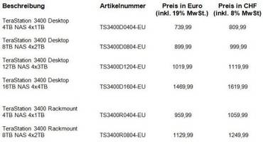 Die neuen Buffalo-Systeme, die es mit 4, 8, 12 oder 16 Terabyte gibt, sind ab sofort erhältlich. Die Preise für die NAS-Lösungen variieren, je nach Ausstattung und Speicherkapazität, von 739,99 Euro bis 1.469,99 Euro. Hier die einzelnen Produkte und Preise im Überblick.