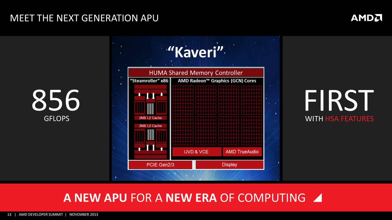 Die technischen Spezifikationen klingen zumindest schon einmal nicht schlecht. So soll das künftige High-End-Modell, der in 28 nm gefertigte und auf der "Steamroller"-Architektur basierende AMD A10-7850K, über einen Standard-Takt von 3,7 GHz verfügen, der sich im Turbo-Modus auf 4 GHz (und mehr) erhöht. Die integrierte Radeon R7, die auf die Graphics Core Next-Architektur setzt, besitzt 512 Shader und einen Takt von 720 MHz, sodass die APU-Lösung insgesamt 856 GFLOPs erreichen soll.