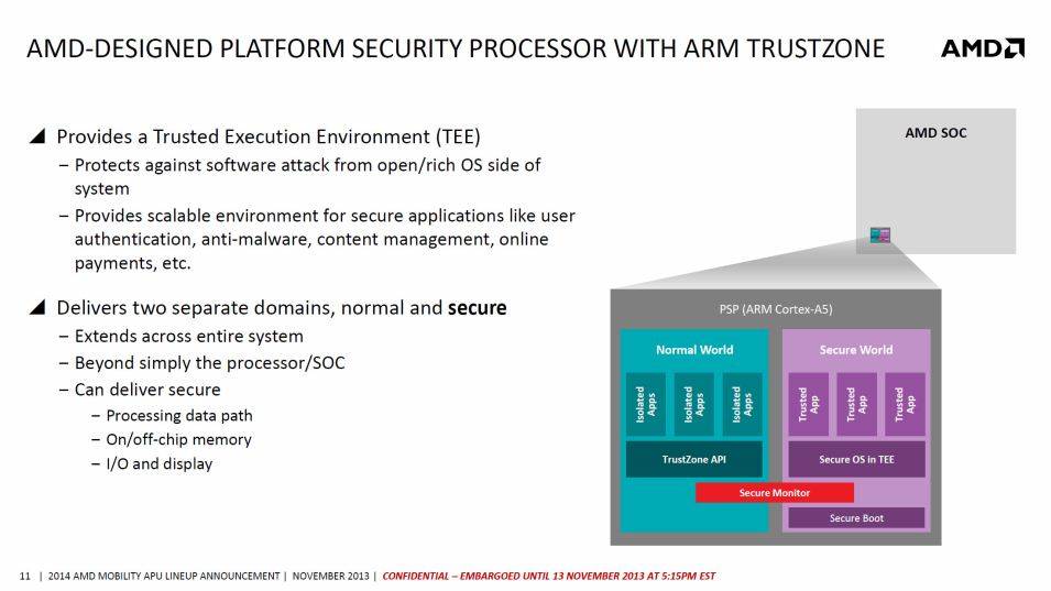 Zudem kommt bei beiden Modellen auch ARMs Trustzone zum Einsatz. Dahinter verbirgt sich ein zusätzlich in die SoCs implementierter Cortex-A5-Prozessor, der, in Verbindung mit Windows 8.1, die Funktionen Wireless Display über Miracast und InstantGo realisieren soll. Interessant ist zudem die Tatsache, dass sich AMD von der herkömmlichen TDP-Angabe (Thermal Design Power) verabschiedet und stattdessen, wie auch schon Konkurrent Intel, die Bezeichnung SDP (Scenario Design Power) einführt.