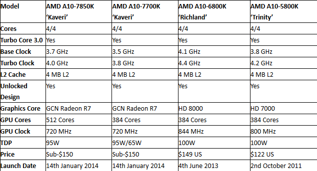 Die A10-7700K-APU soll es in zwei Varianten geben: einmal mit 95 Watt TDP (Thermal Design Power), was auf dem Niveau des A10-7850K wäre, und eine Version mit nur 65 Watt TDP. Höchstwahrscheinlich wird die niedrigere Leistungsaufnahme, wie auch bei den aktuellen Modellen, über einen reduzierten GPU-Takt erzielt.