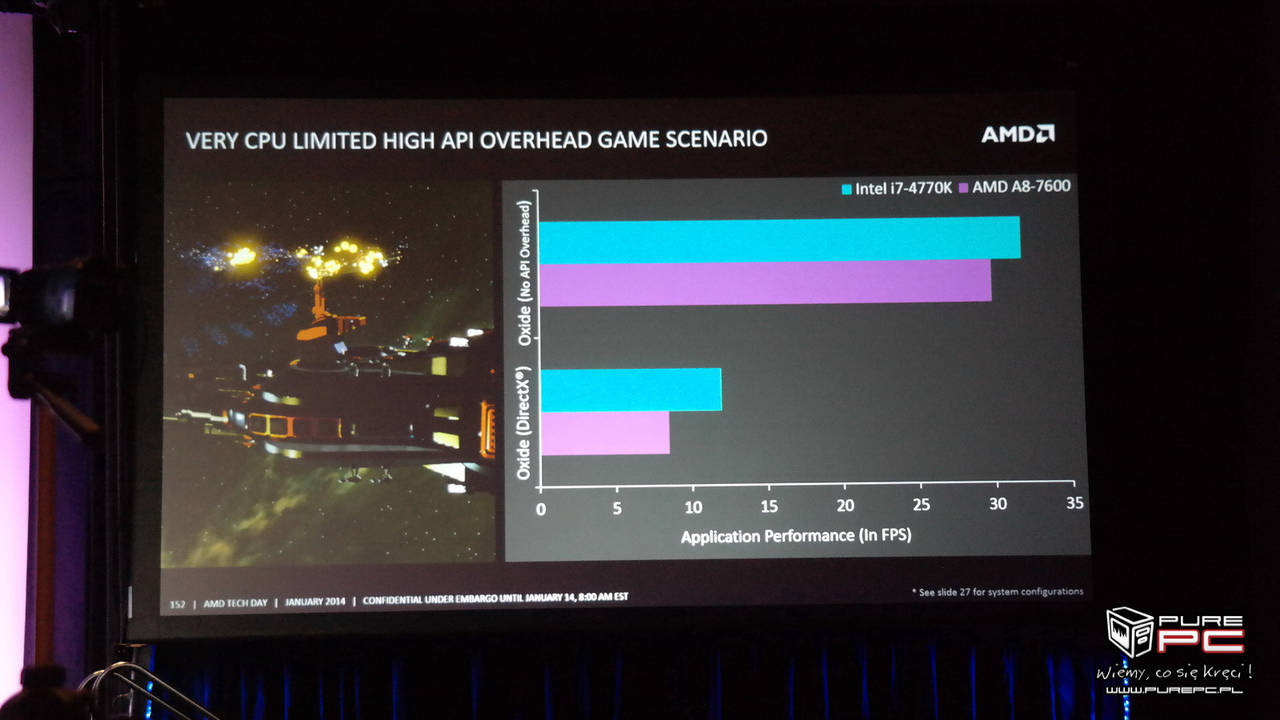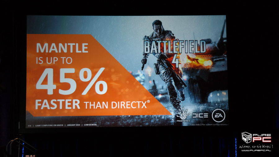 Neben den APUs gibt es auch Neuigkeiten zur "Mantle"-API. Laut einer Marketing-Folie soll die AMD-Lösung, zumindest in Battlefild 4, bis zu 45 Prozent schneller sein als die DirectX 11.1-Variante. Auch bei der Starswarm-Demo, die auf die eigene "Nitrous"-Engine setzt, soll "Mantle" die Nase vorn haben; hier erreicht die "Kaveri"-Plattform 30 anstatt 8 FPS.