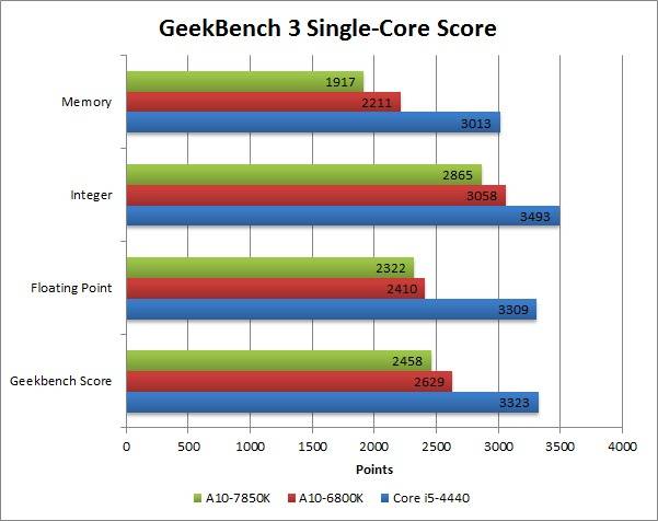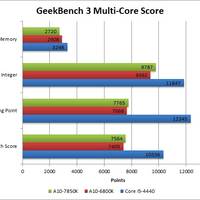 Die Webseite PugetSystems hat die neue APU unter anderem in verschiedenen Spielen (Alien vs. Predator, Batman: Arkham City, Just Cause 2, Hitman: Absolution und Street Fighter IV Arcade Edition) sowie CPU- (GeekBench 3) und System-Benchmarks (PCMark 8 und CineBench R15) getestet, sodass Nutzer einen guten Gesamteindruck darüber bekommen können, was der Prozessor leisten kann. Das Ergebnis ist jedoch nicht so eindeutig, wie es sich AMD vielleicht gewünscht hätte. Wird die integrierte Radeon R7-GPU gefordert, kann sich der A10-7850K von den beiden anderen Testkandiaten absetzen; den A10-6800K hält man mit minimal 2,6 bis maximal 7,9 FPS auf Abstand, die Intel HD4600 sieht hingegen kein Land. Das Bild ändert sich allerdings schlagartig, sobald der CPU-Part in Anspruch genommen wird; dann kann die ältere AMD-Generation den "Kaveri"-Neuling in die Schranken weisen. Der Intel-Prozessor entfaltet hier sein volles Potential und lässt seine beiden Kontrahenten ganz schön alt aussehen.