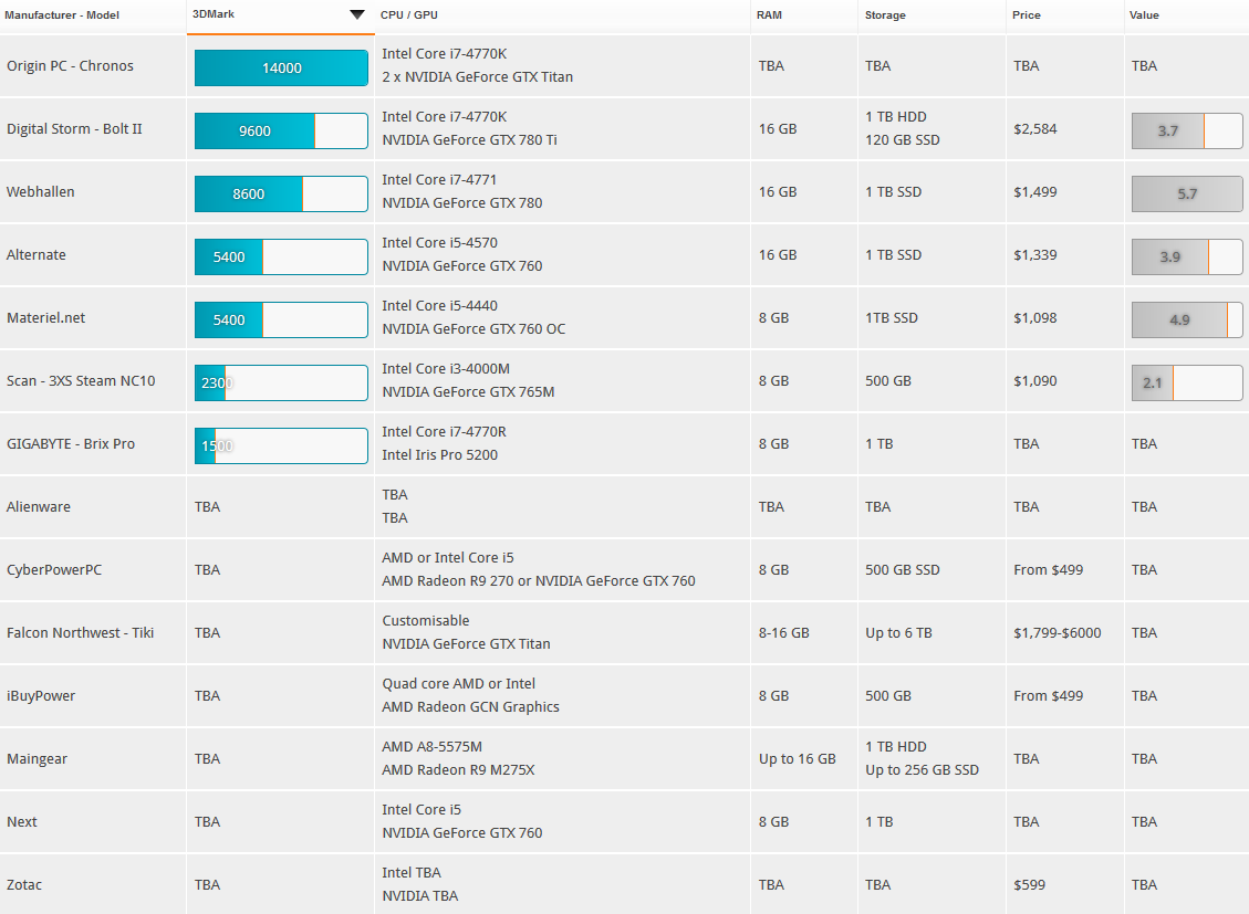 Unangefochtener Spitzenreiter im 3DMark ist der Chronos-Rechner von Origin PC. In diesem werkelt nicht nur ein Intel Core i7 4770K-Prozessor (4x 3,5 GHz), sondern auch zwei Nvidia GeForce GTX Titan-Grafikkarten, sodass im Benchmark 14.000 Punkte erreicht werden. Platz zwei, mit 9.600 Punkten, geht an den Bolt II von Digital Storm. Hier ist ebenfalls der Intel Core i7-4770K verbaut, doch anstatt eines SLI-Gespannes kommt hier nur eine GeForce GTX 780 Ti zum Einsatz. Die Bronzemedaille geht an die Webhallen-Steam Machine, die über einen Core i7 4771 (4x 3,5 GHz) und eine GeForce GTX 780 verfügt; diese Hardware-Kombination erreicht im 3DMark 8.600 Punkte. Der Alternate-PC, der für viele Anwender sicherlich am interessantesten ist, da hierzulande erhältlich, landet auf dem vierten Platz; mit 5.400 Punkten. Derzeitiger "Abstiegskandidat" ist der Brix Pro von Gigabyte, der zwar eine schnelle CPU besitzt (i7-4770R, 4x 3,2 GHz), dafür aber mit der Intel-IGP (Iris Pro Graphics 5200) auskommen muss.