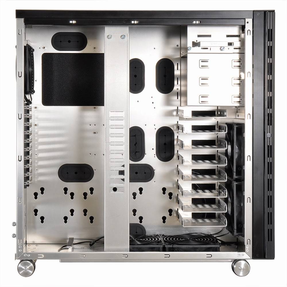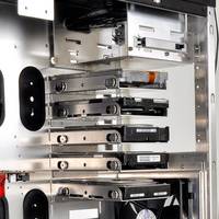 Außen also kaum Unterschiede, doch wie sieht es im Inneren aus? Im Vergleich zum PC-2120 wird auf einen Mainboard-Schlitten verzichtet, sodass der Mainboard-Tray (bis XL-ATX) nun fest mit dem Gehäuse verbunden ist. Auch die räumliche Abtrennung zwischen der Platinen und dem Boden des Gehäuses musste weichen, auch der Laufwerkskäfig für die 3,5-Zoll-HDDs ist entfernt worden. Platzprobleme dürfte es beim PC-2130 allerdings trotzdem nicht geben, denn stattdessen finden sich hier acht Einschübe wieder, die sich einzeln entnehmen und bestücken lassen.